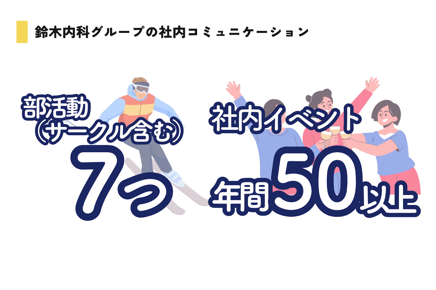 歓迎会や懇親会、部活動も含めると社内イベントは年間50回以上です。普段の業務では接点がないスタッフ同士の親交を深めたり、趣味に打ち込み日々のストレス解消ができ心身のバランスを整えることができます。