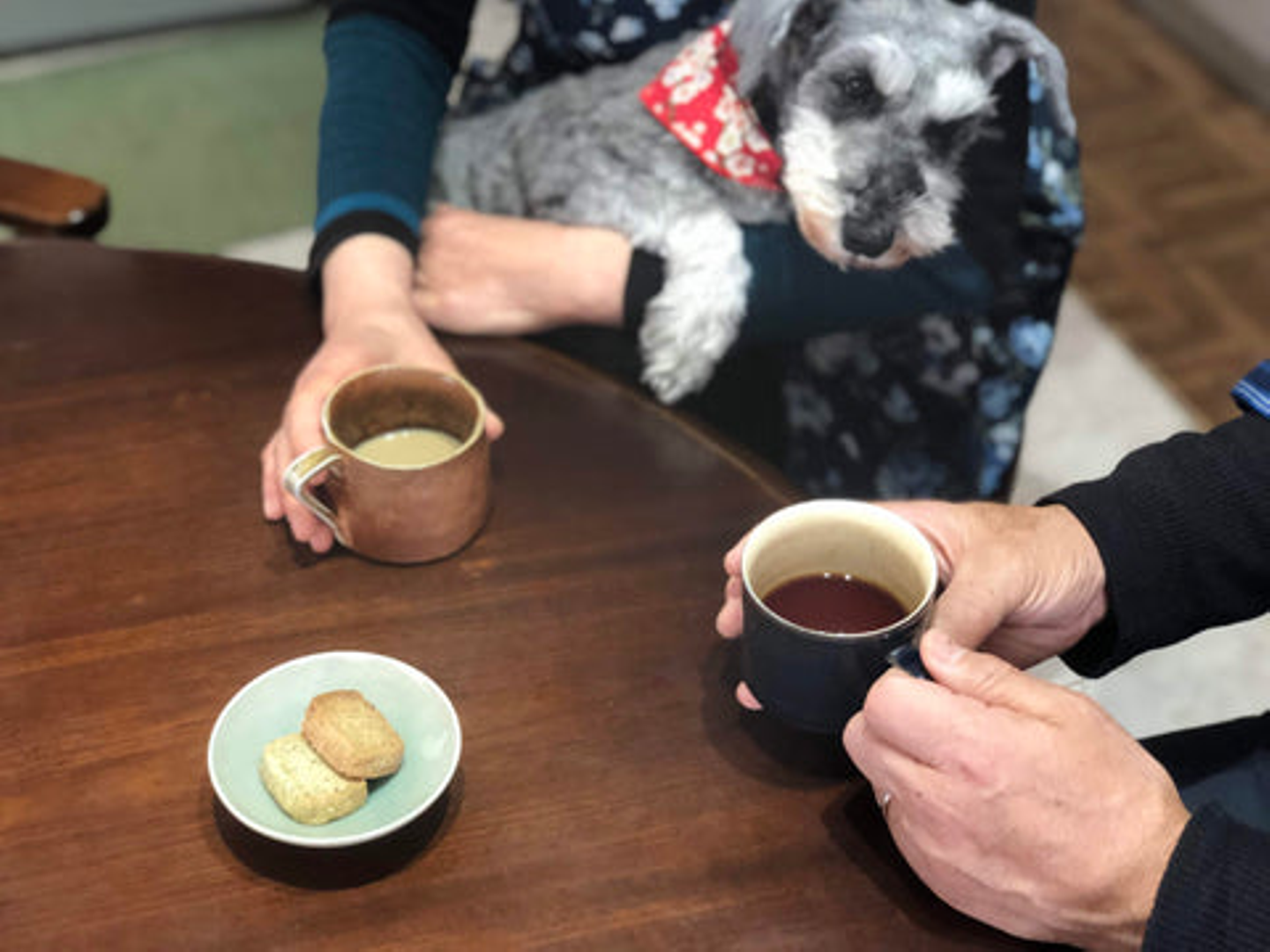 ご両親は、Runatsuがコーヒー屋さんで働き始めてから浅煎りも含めて飲むようになったそうです。可愛いわんこはミニチュアシュナウザーのめいちゃん。