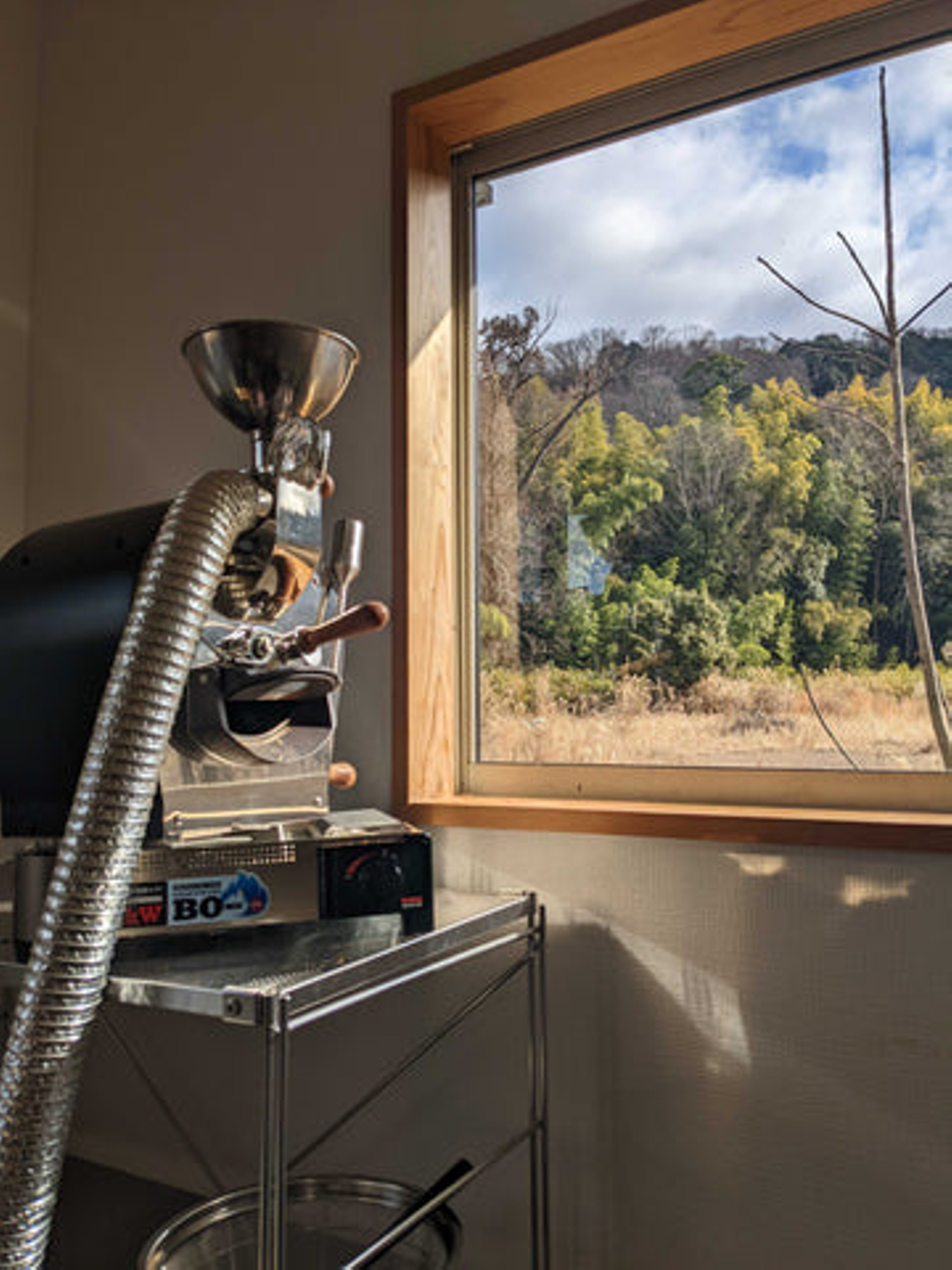 大きな窓から見える自然豊かな景色と焙煎機、まるで映画のシーンのようです。