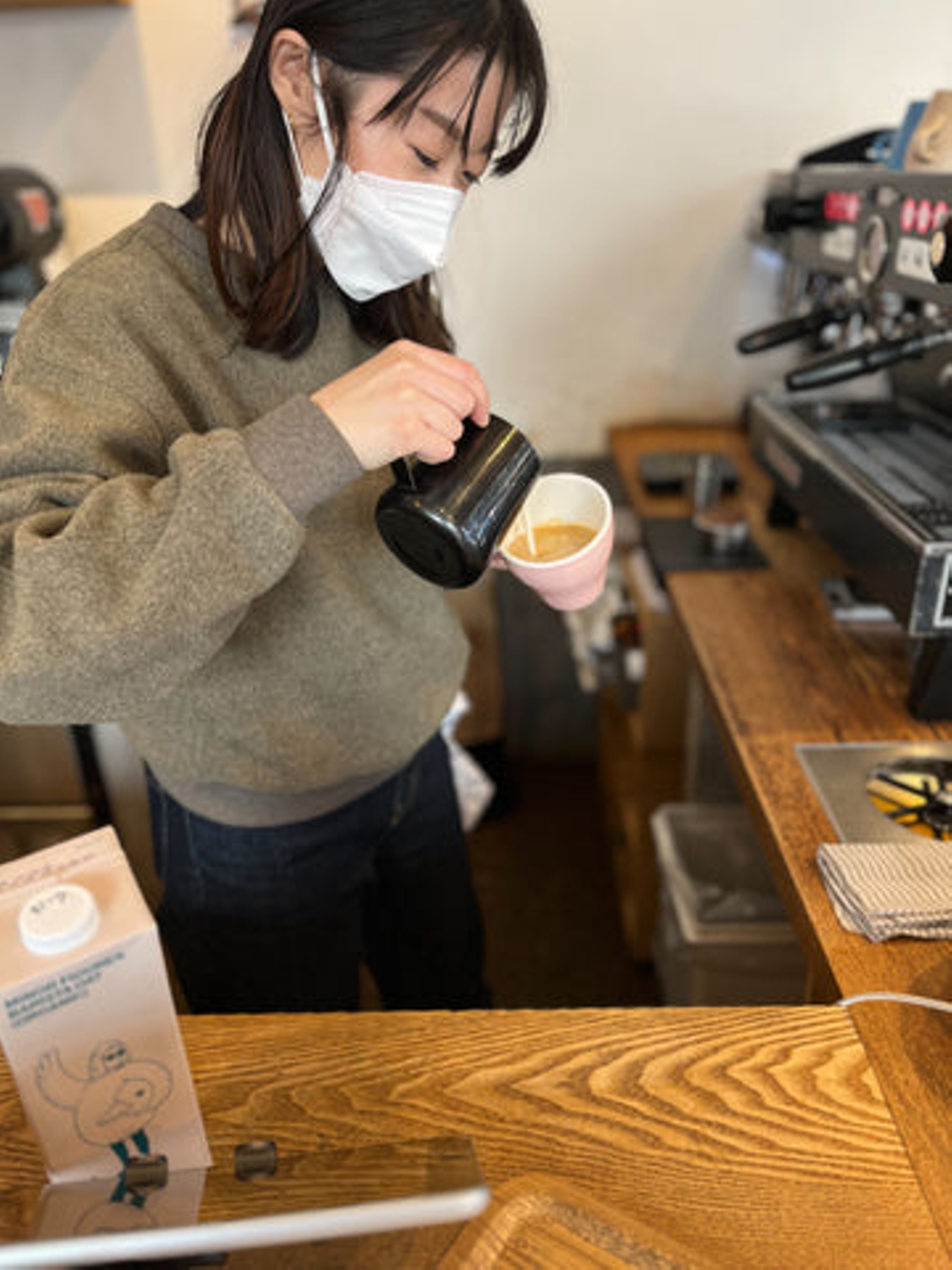 自宅で本格的なラテを楽しんでいるYuko、使用した豆は冬萌。