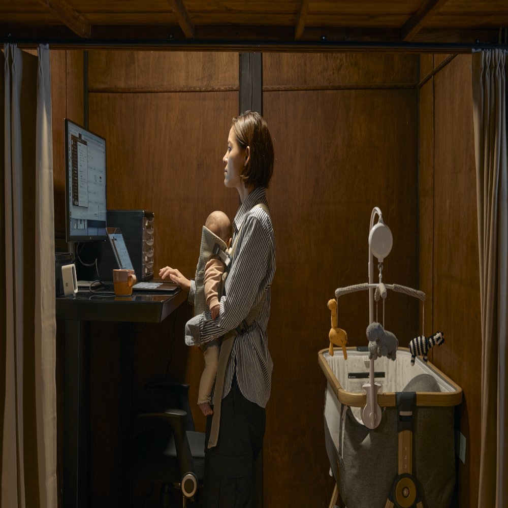 (写真:ベビーベッドのそばに昇降式のデスクを設置して、抱っこしながら仕事しやすい環境に)