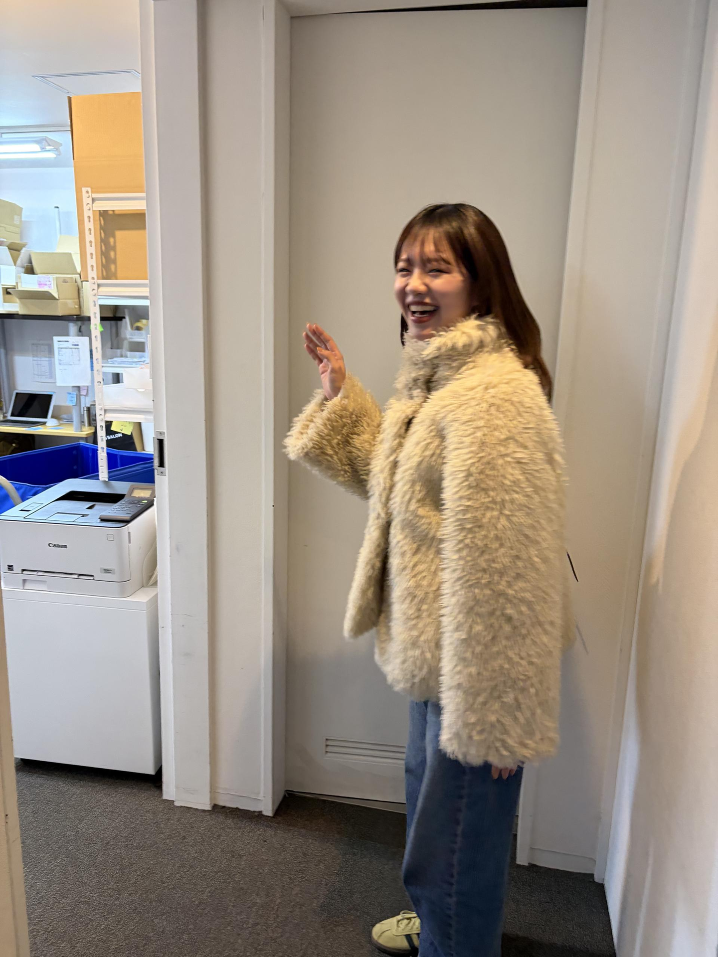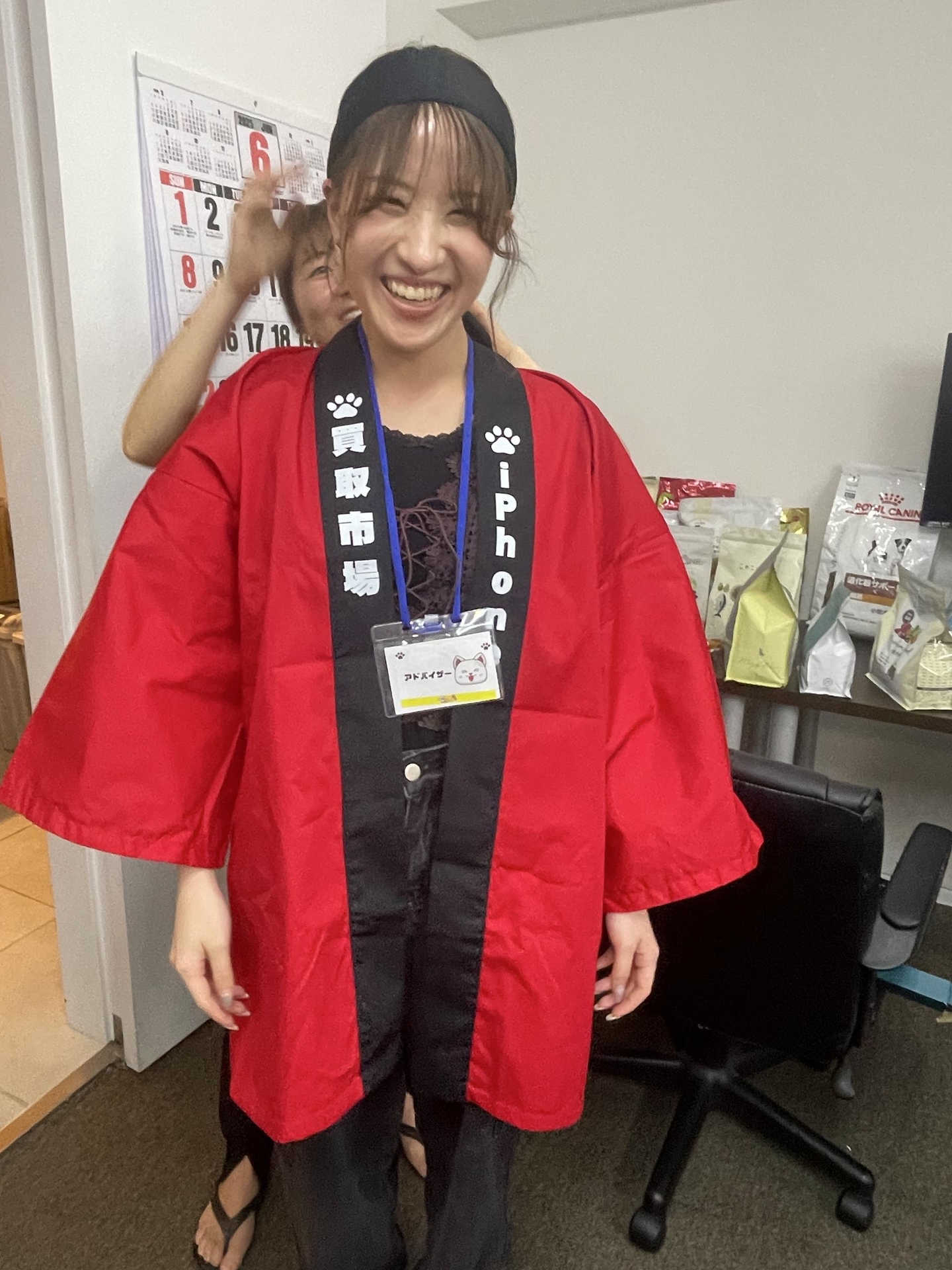 ⬇︎買取事業のグッズを作ったので、事業担当者が試着中笑