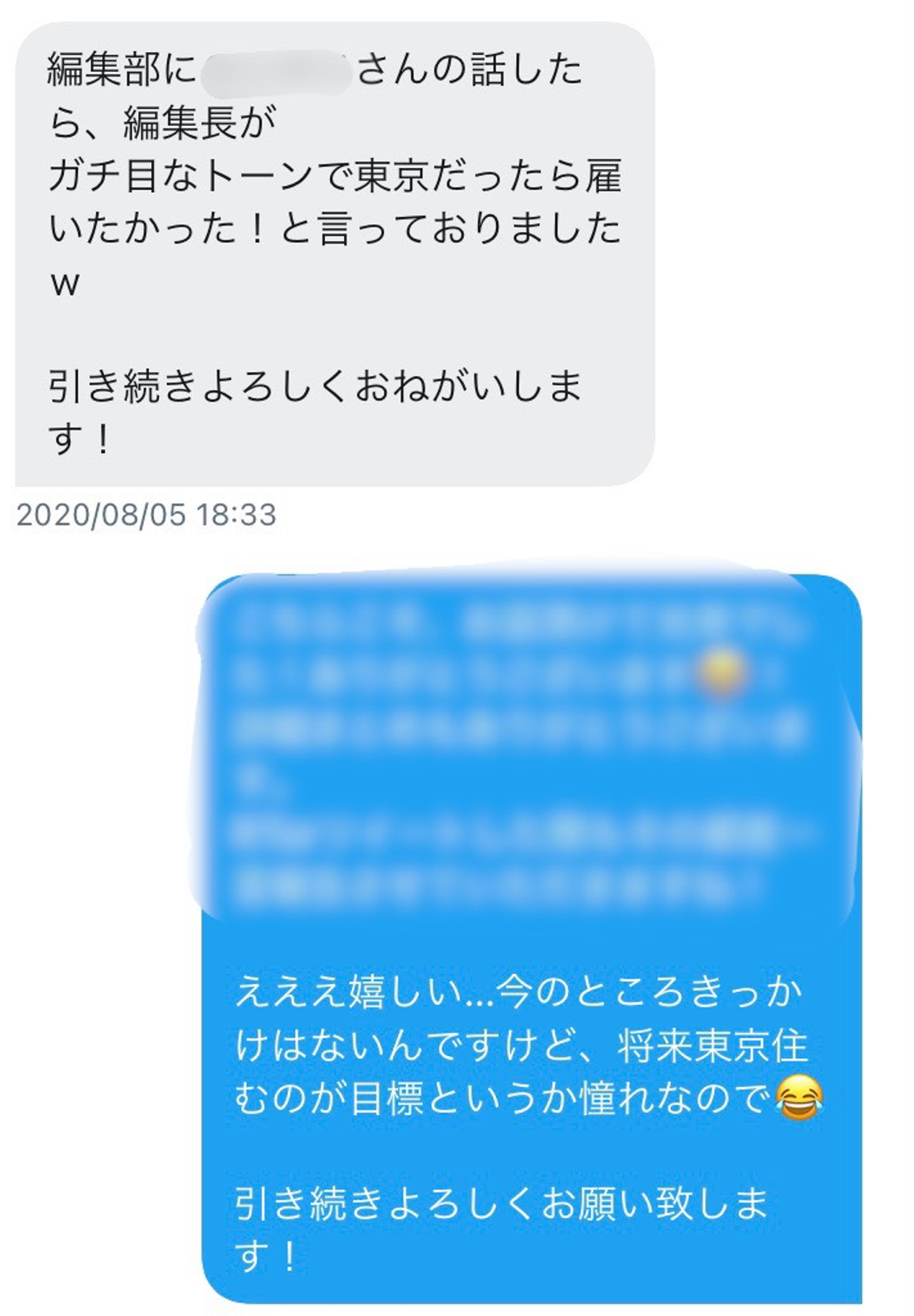 サラッと、編集長に「東京に住んでいたら雇いたかった!」と言っていただけたことを教えてもらいました。