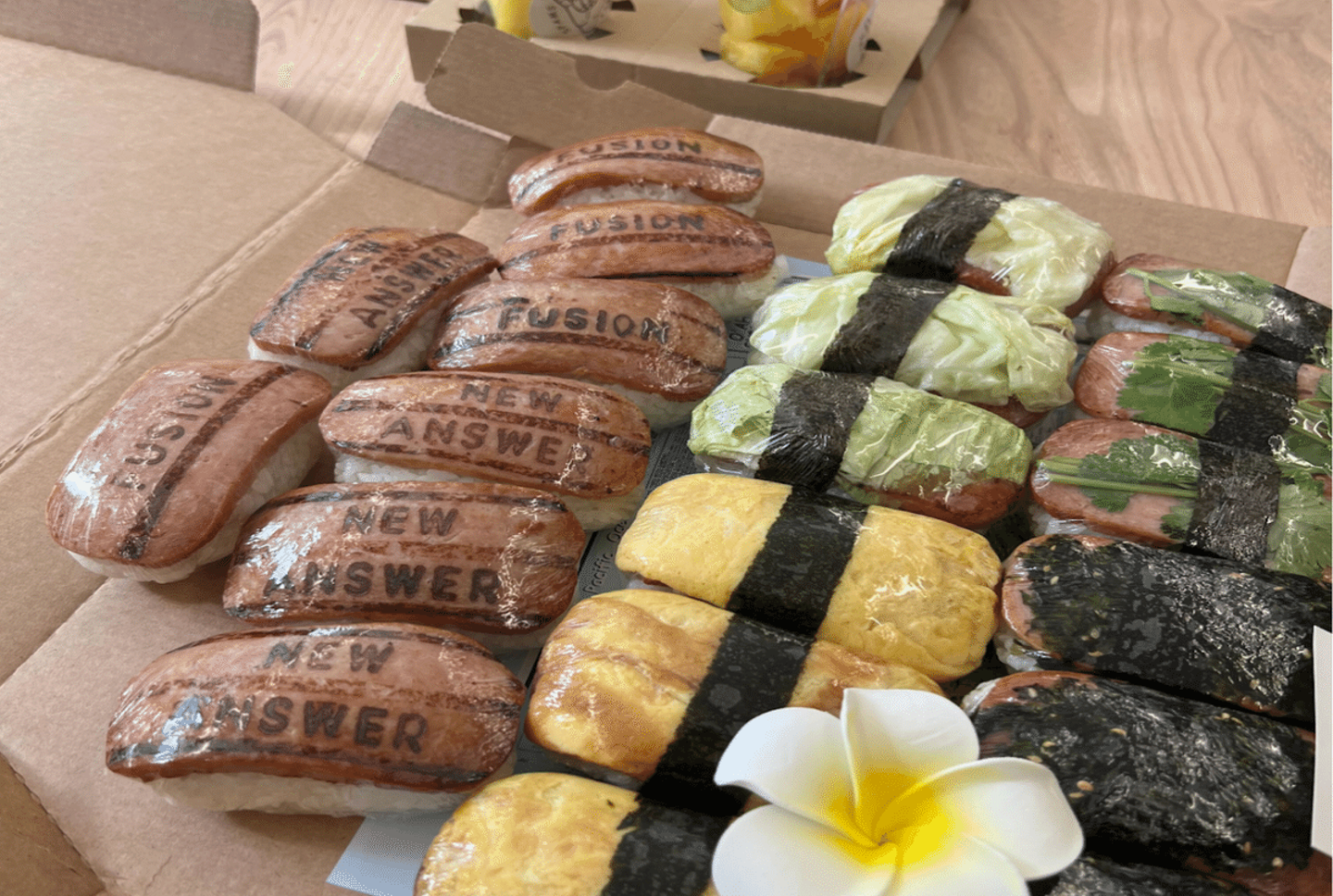 会社のロゴとタグラインを焼印でいれてもらったスパムバーガー