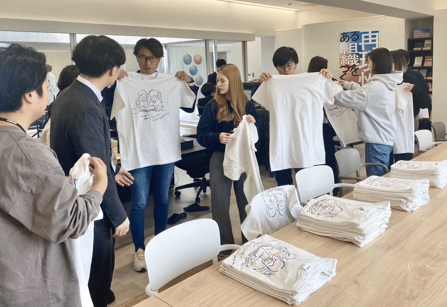 会社設立4周年を記念し、社内で配布するためのTシャツを制作しました。Tシャツには会社のタグラインである“NEW ANSWER COMPANY”というキーワードとオリジナルのイラストが描かれています。モデルを起用した撮影を行い、完成したクリエイティブは渋谷モディに屋外広告として掲出しました。