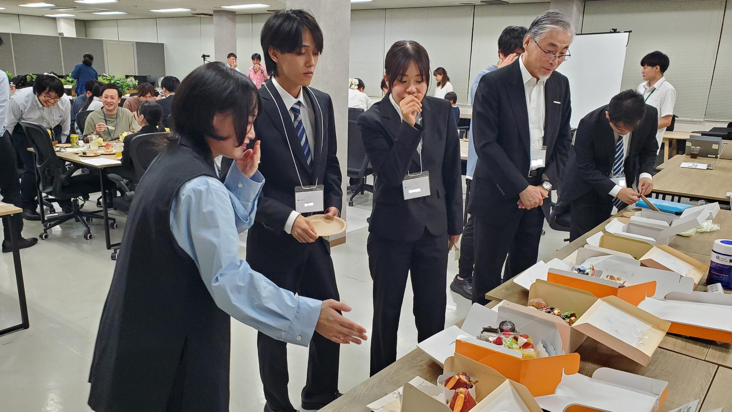 「内定者の皆さんが社員と楽しそうに会話しながら料理を取りに行っていて、