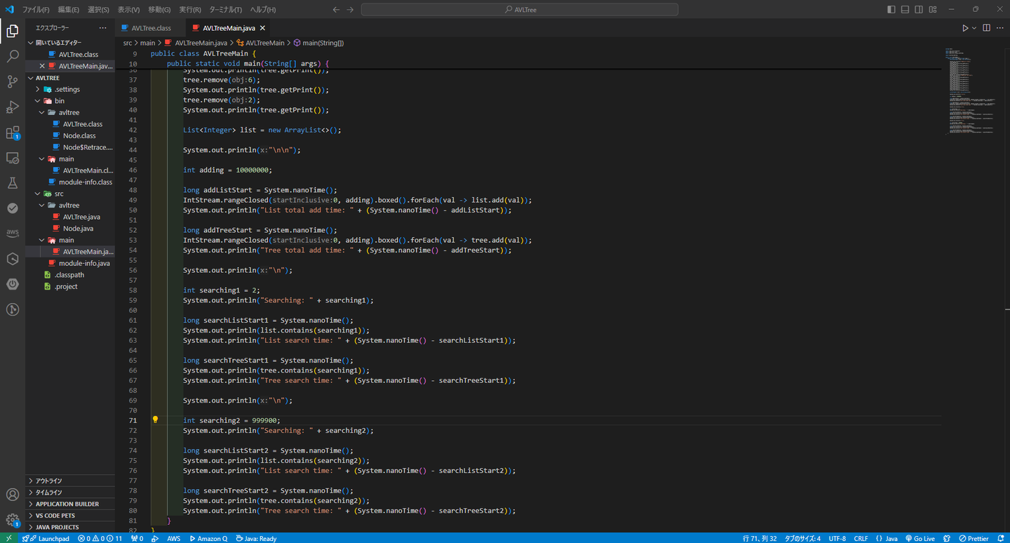 以下のサンプルではAVL木とArrayListにそれぞれ10,000,000の数字を1から順に挿入していき、そこから値が存在するかを確認するまでの時間(ns)を計測してみました。(時間の計測方法は力尽きたので適当です)