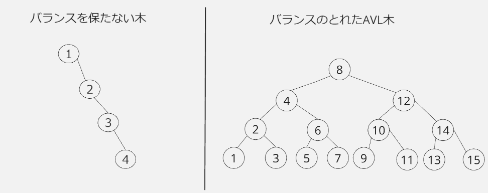 AVL木とは二分探索木の一種で、自動的に木のバランスを保つことで要素の探索計算量を
