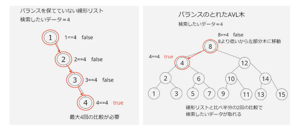 しかし自動的にバランスを取ることによってO(logn)の探索計算量で探索が可能になります。