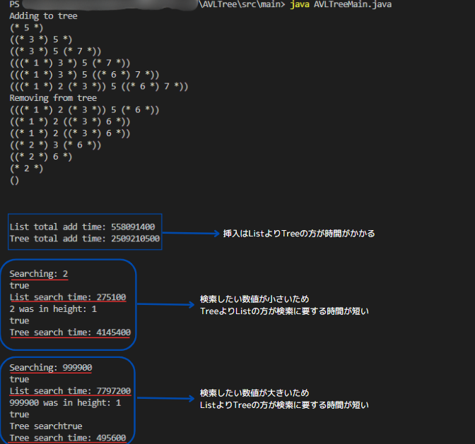 AVL木への挿入はバランスを取る処理が必要なためArrayListに比べるとかなりの時間を要しますが、探索では圧倒的な処理速度を記録しています。