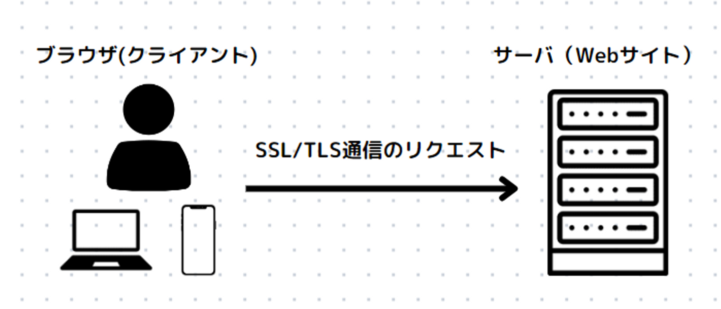 1️⃣ブラウザからサーバへSSL/TLS通信のリクエストを送り「今から暗号化通信始めるよ~」とリクエストを送ります