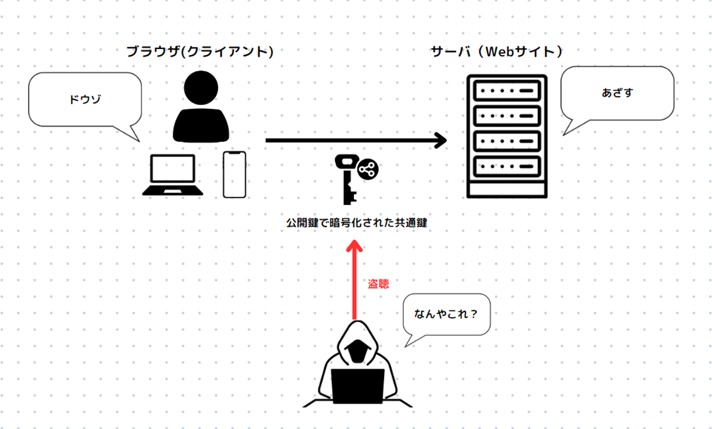 3️⃣クライアント側でランダムに共通鍵を生成しその共通鍵を、サーバから送られた公開鍵を用いて暗号化してサーバに送ります。これのおかげで盗聴されたとしても中身が分からない状態になっております。