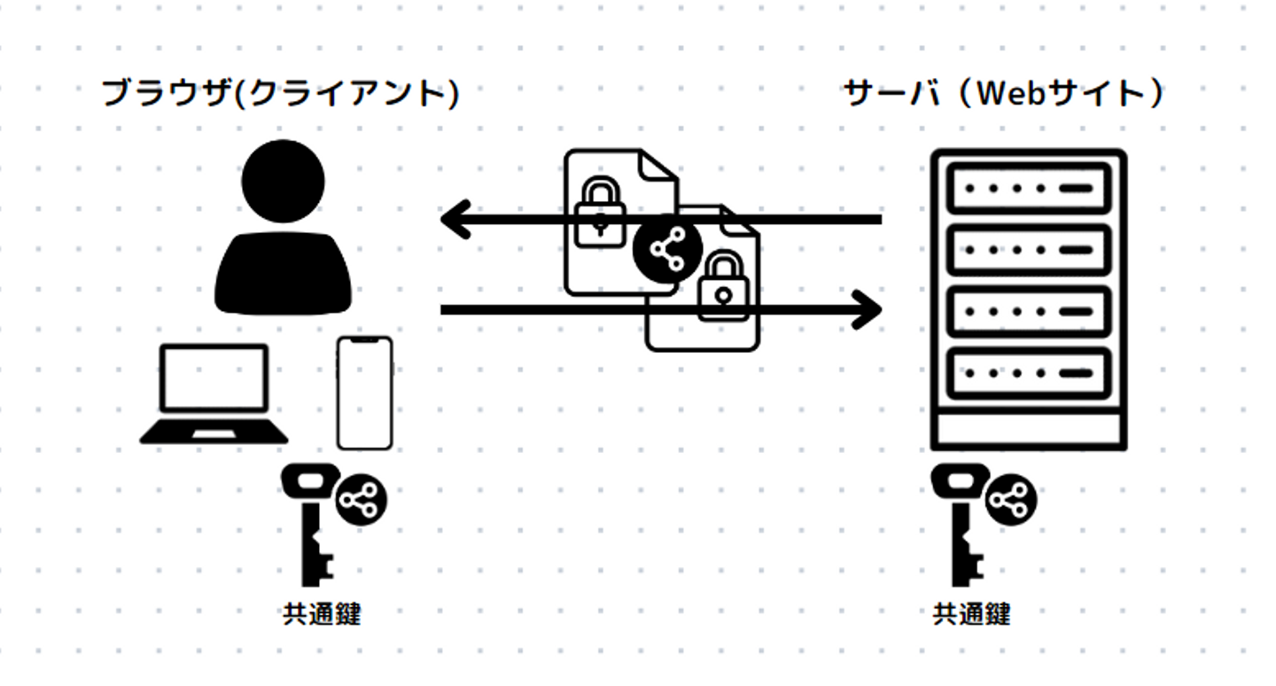 これでサーバーとクライアントが同じ共通鍵を持てたので、以降の通信は共通鍵暗号方式で暗号化して安全にやりとりします。
