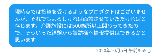 ただ、当時はエクイティでの資金調達は全く予定していなかったので、次のようなメッセージを返信しました。