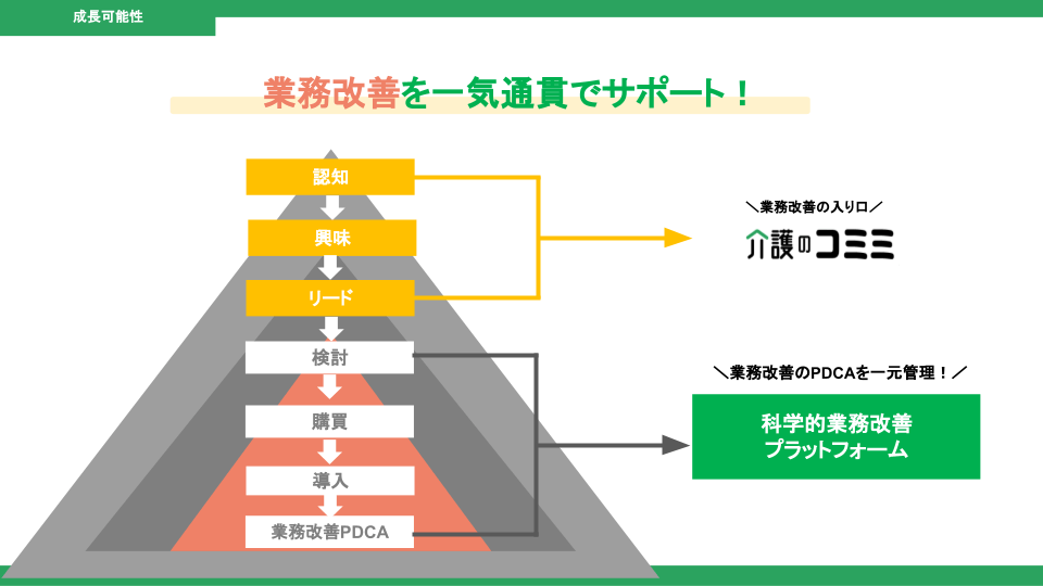 しかし、GiverLinkのミッション「介護のテクノロジーを最適化する」を実現するためには、さらにその先にある「業務改善のPDCA」までフォローする必要があると考えています。