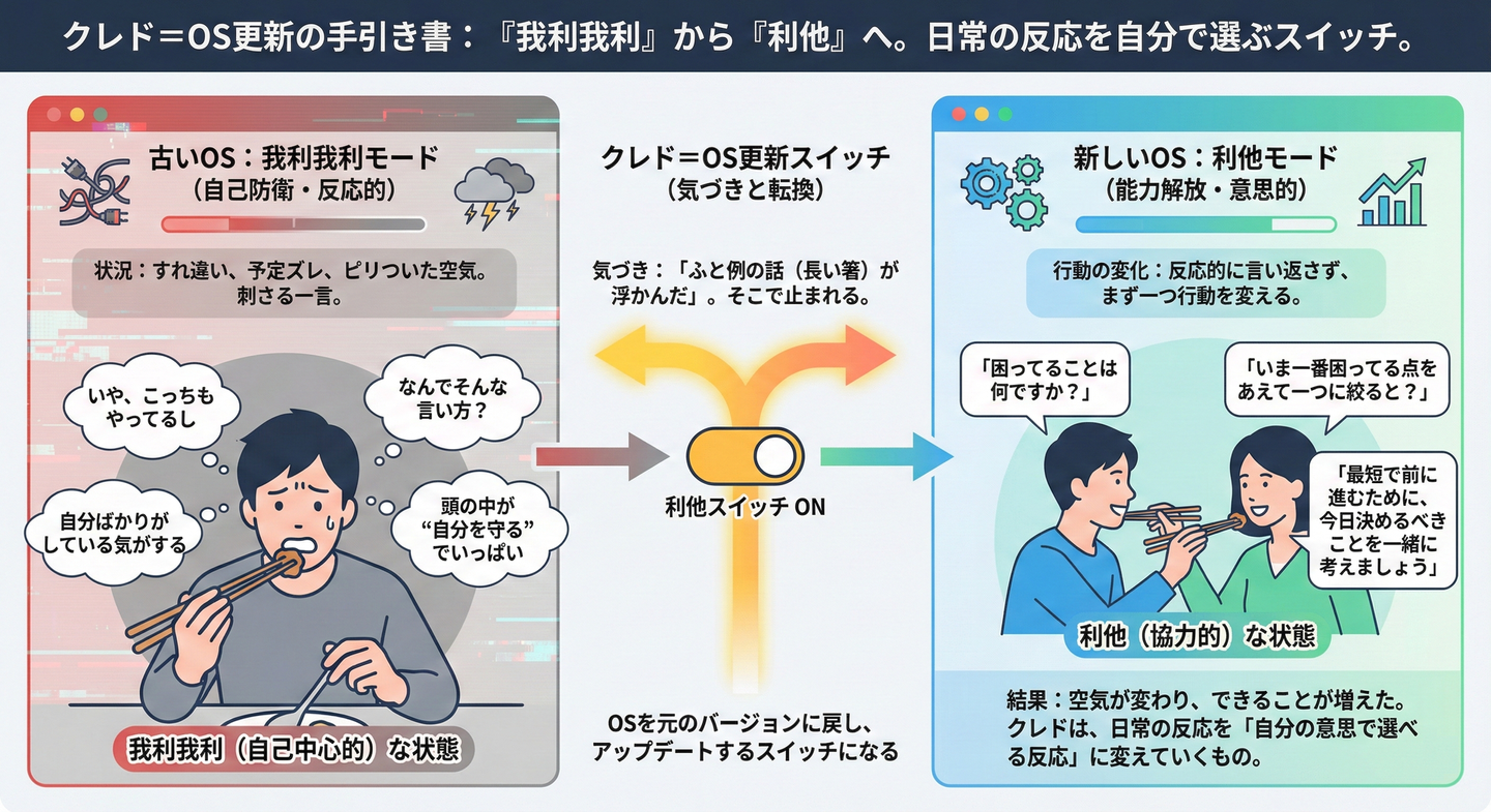 逆に、仕事で利他(自分の利益や都合を後回しにし、他者の幸福や利益を優先して行動する姿勢や精神)のOS(内面)である人は、日常でも利他でありやすい。