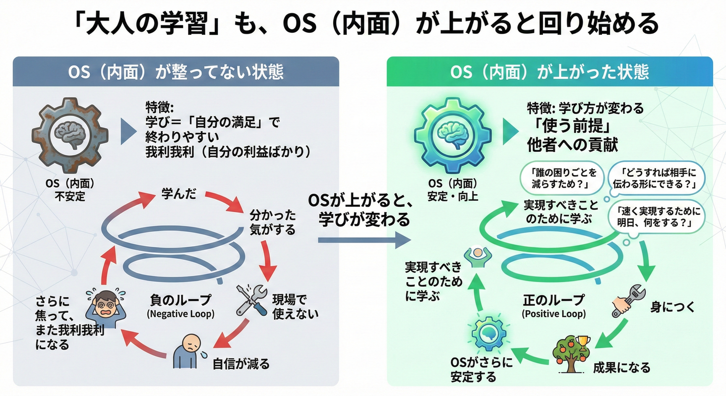 OS(内面)が整ってないと、学びって“自分の満足”で終わりやすいんです。