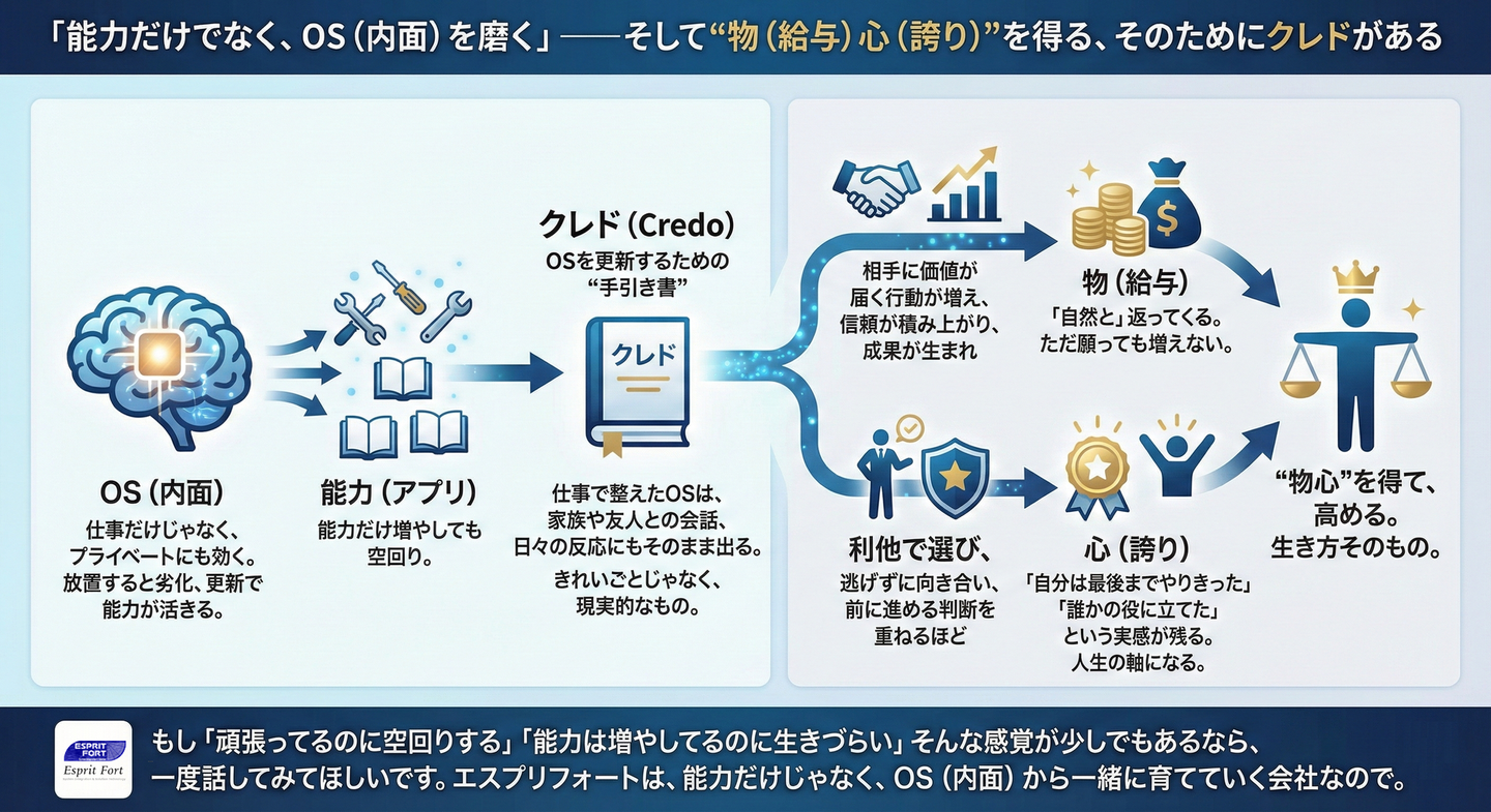 「能力だけでなく、OS(内面)を磨く」——そして“物(給与)心(誇り)”を得る、そのためにクレドがある