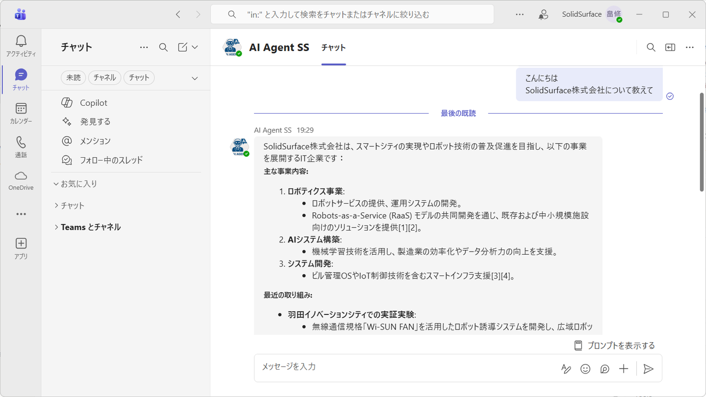 現在、私は技術部のプロジェクトの一環として、Microsoft Teamsと連携するAIチャットボットの開発に携わっています。