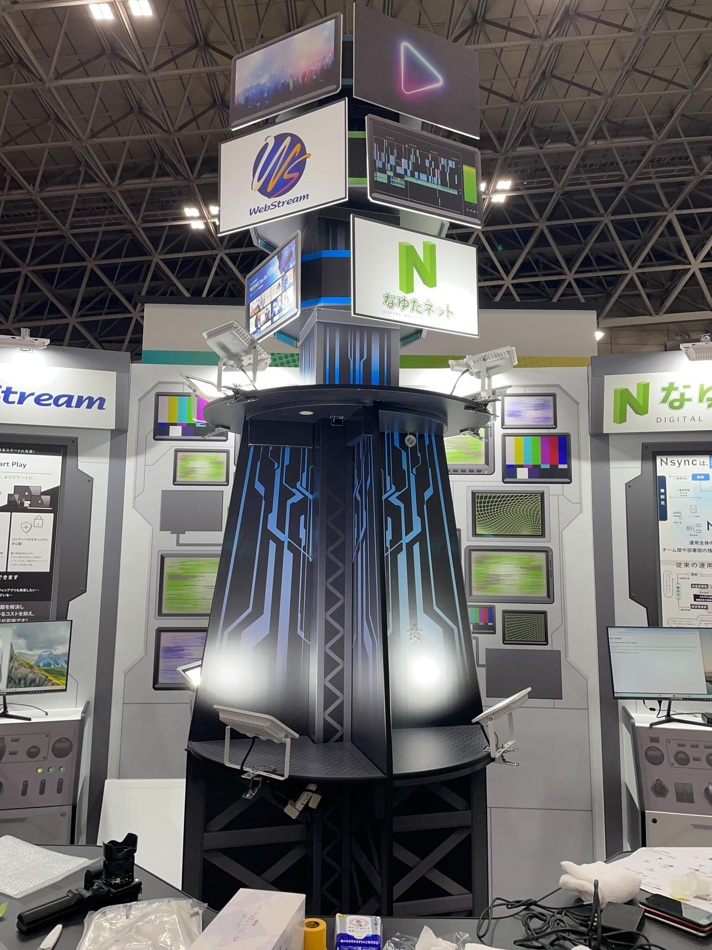 映像制作のラボっぽく、壁面にはいくつかモニターがあったり、機材を操作できる(できそうな)ものがあったりと、出展サービスや会社イメージに合った世界観を体感いただけるようなブースになっております。