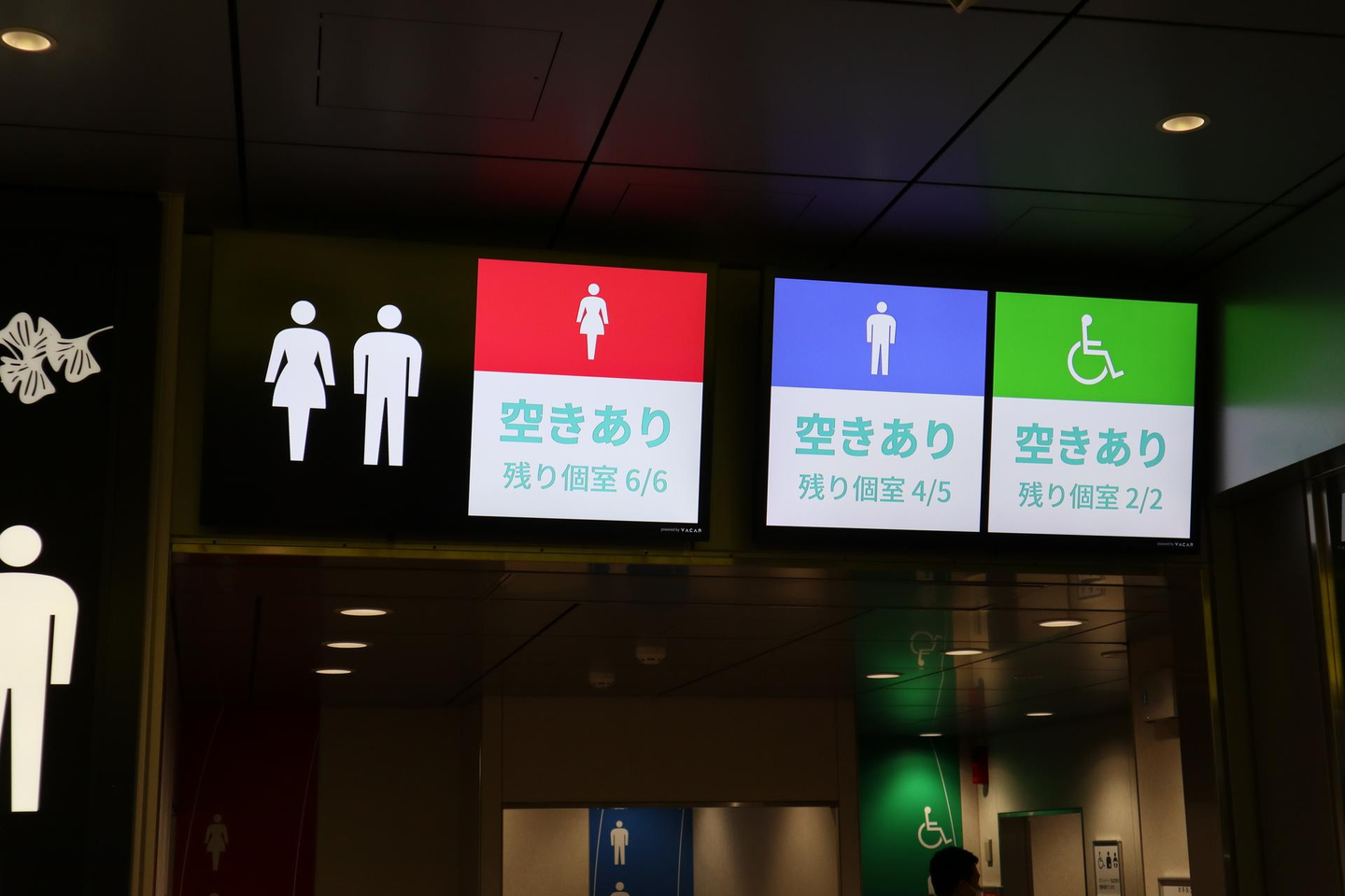 バリアフリートイレを含めたトイレの個室の空き状況を、画面表示で案内している例