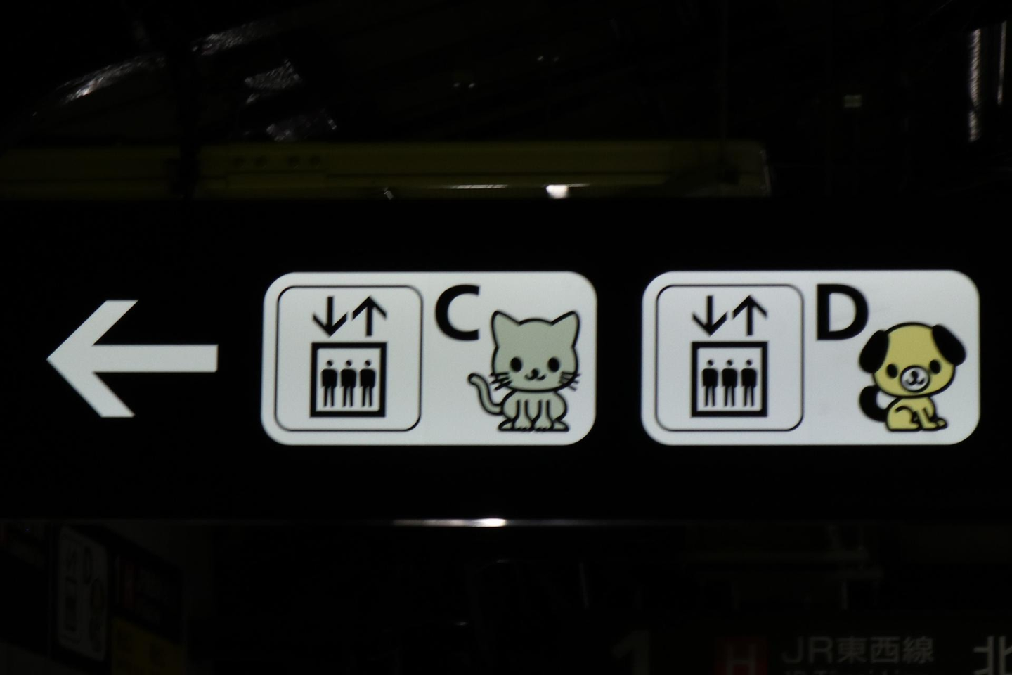エレベーターが多く設置されている駅で、動物の頭文字のアルファベットを使って案内している例