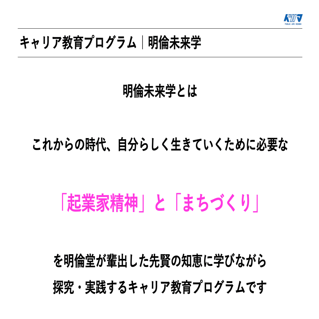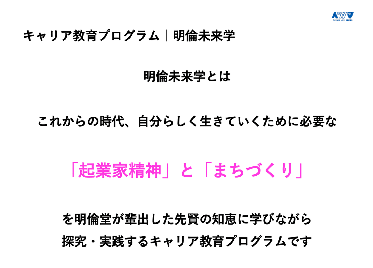 これから総合学習での授業実践を通して、このカリキュラム「起業家精神とまちづくり」をブラッシュアップしていきたいと思います。