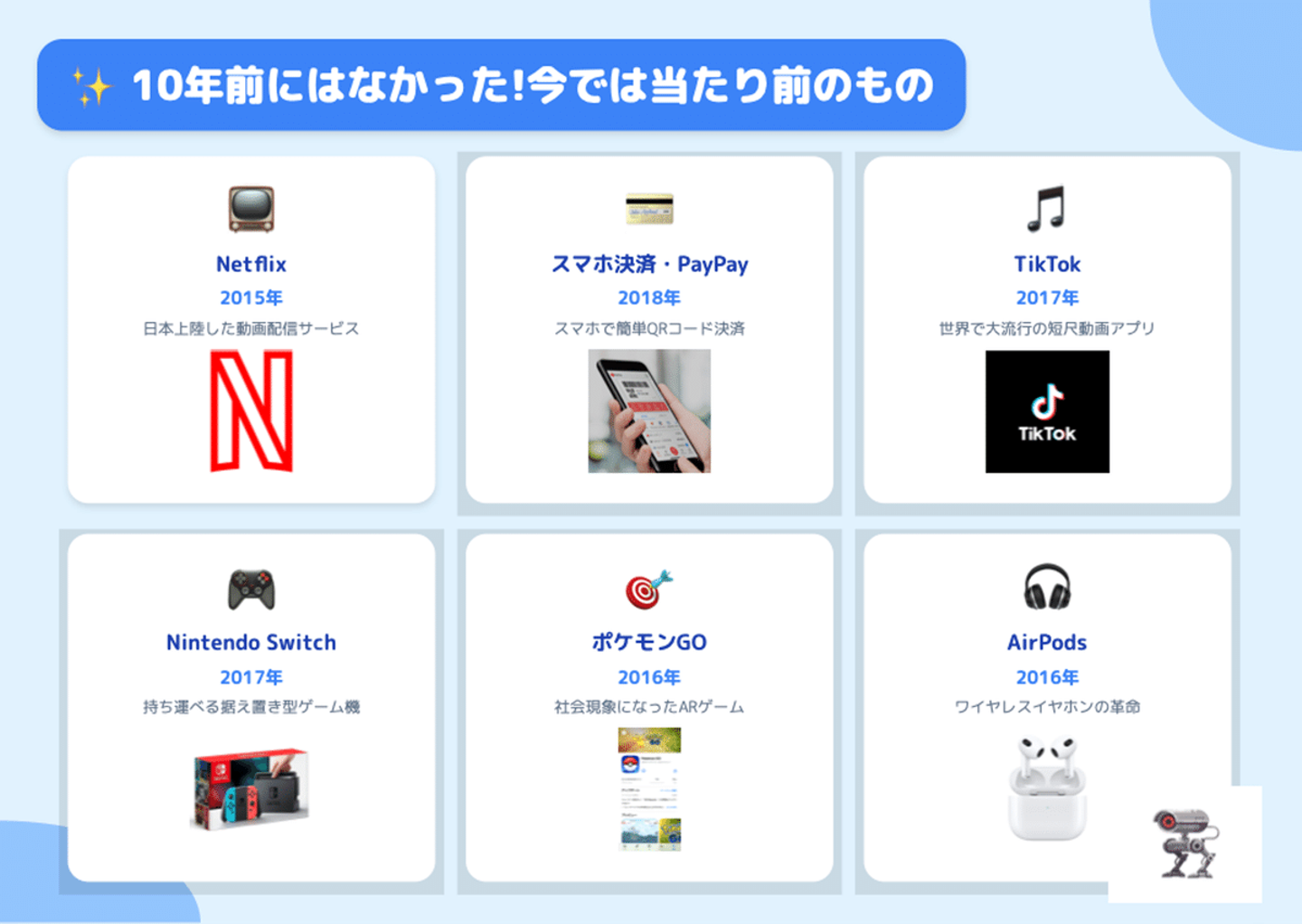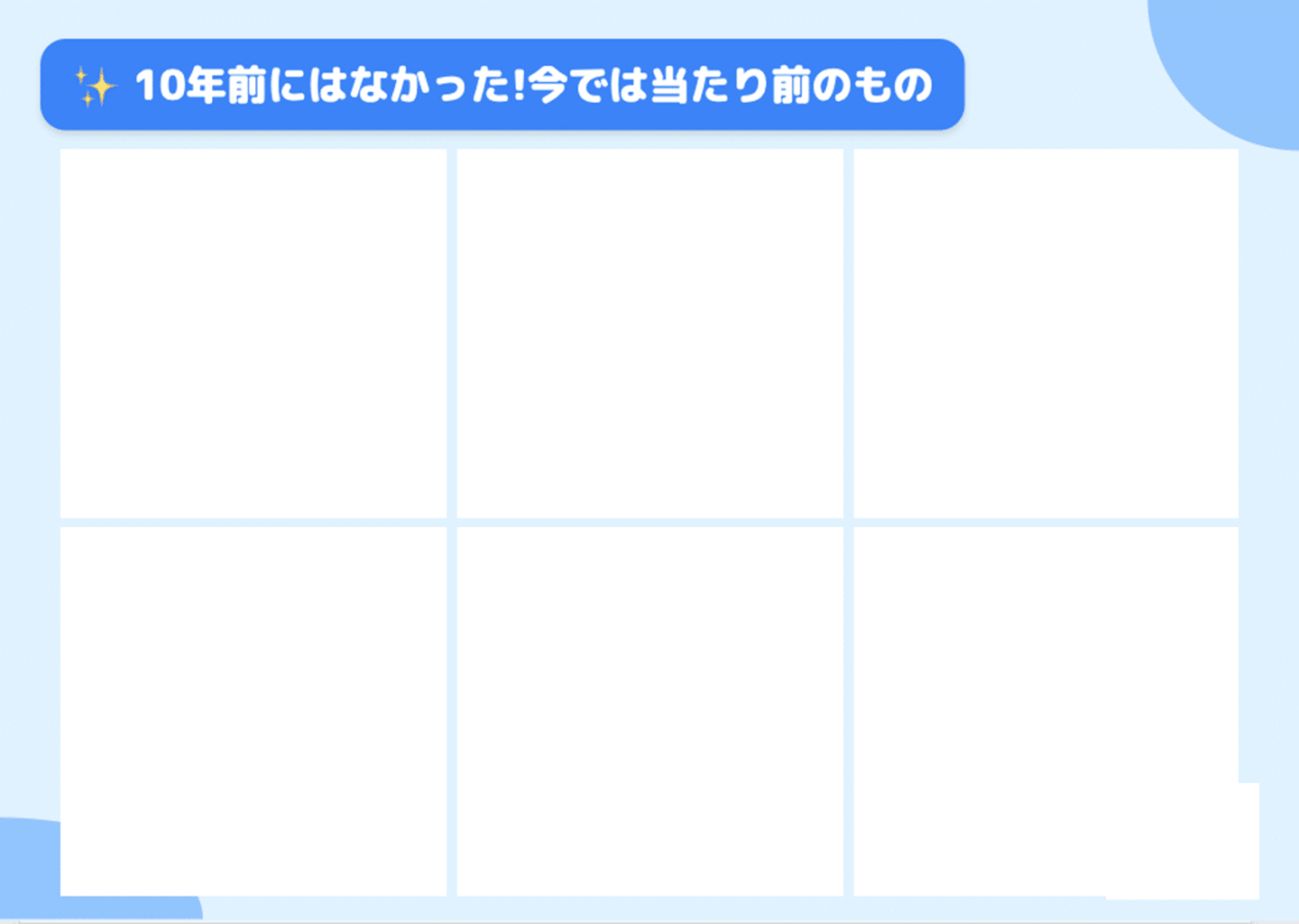 そこで、いま当たり前に使ってるもので10年前なかったものは?