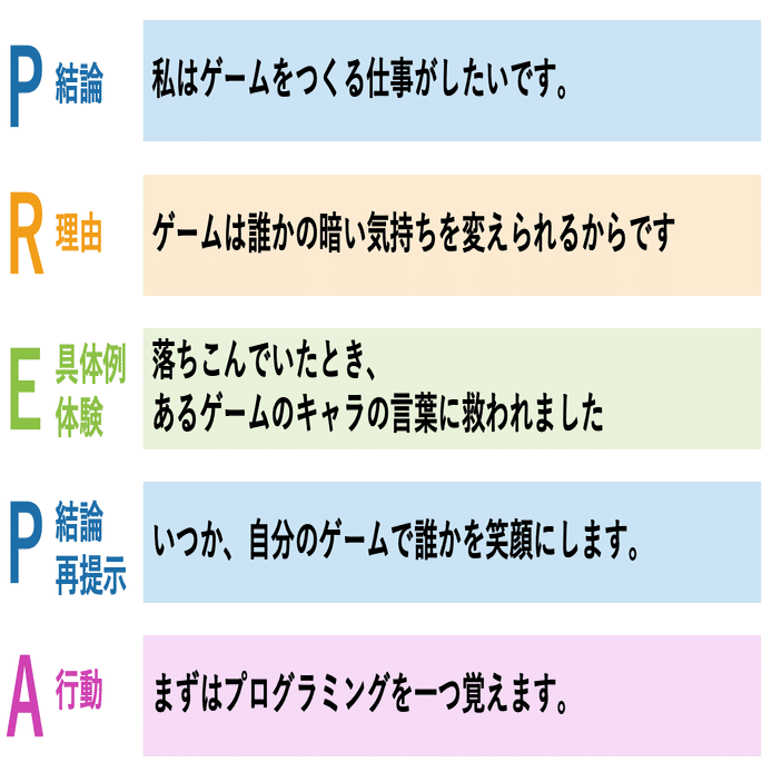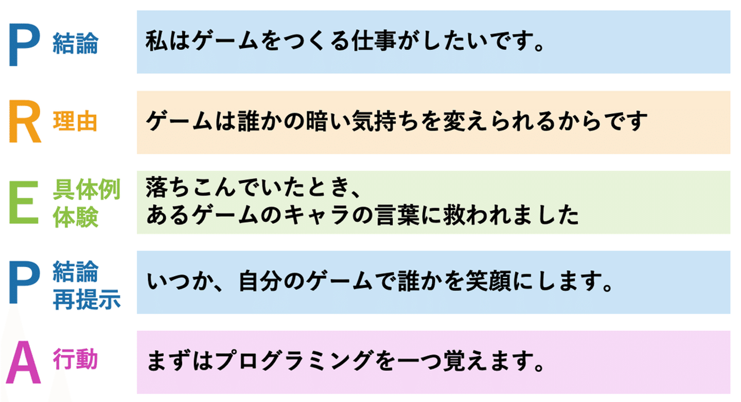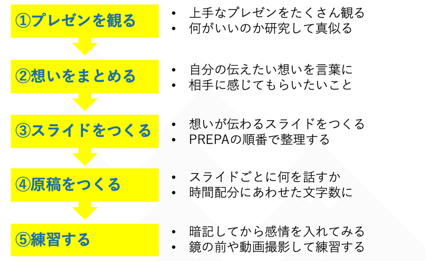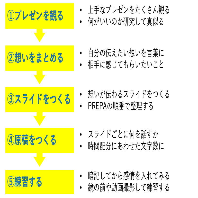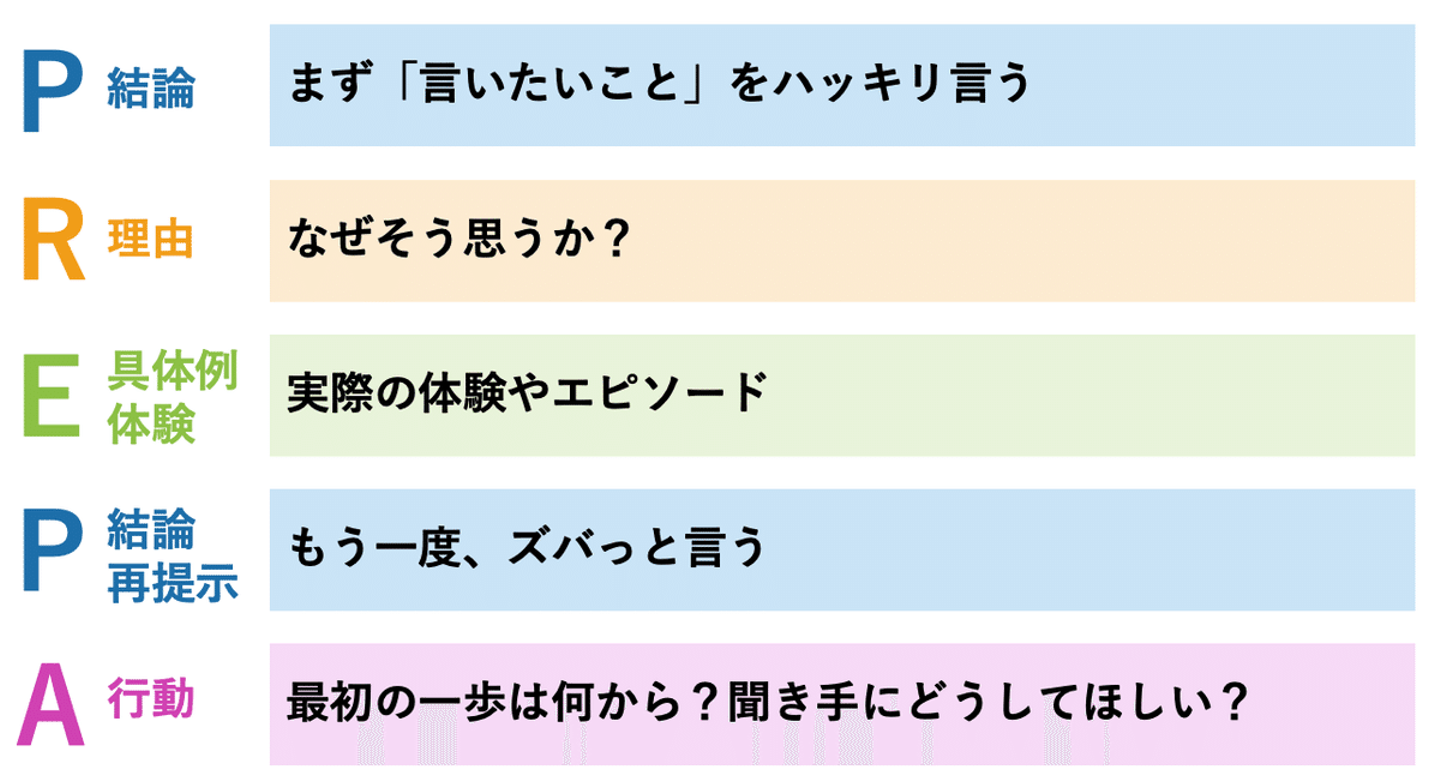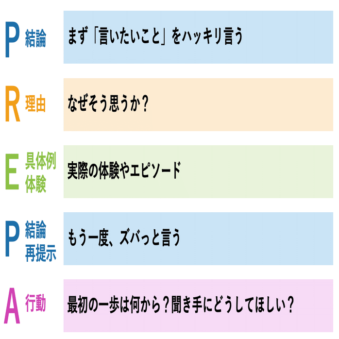 以前、前職で20代社会人と朝の勉強会でプレゼン講座をしていたときも、PREPAで練習してたので最初の型としてはおすすめです。