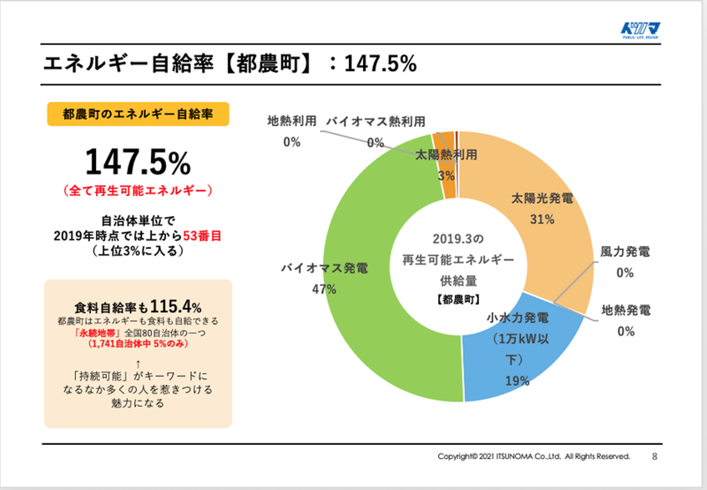 食料とエネルギー、両方を自給できる自治体は「永続地帯」と呼ばれ、全国でも80自治体のみ、今後、都農町の強みとして、注目すべきデータです。