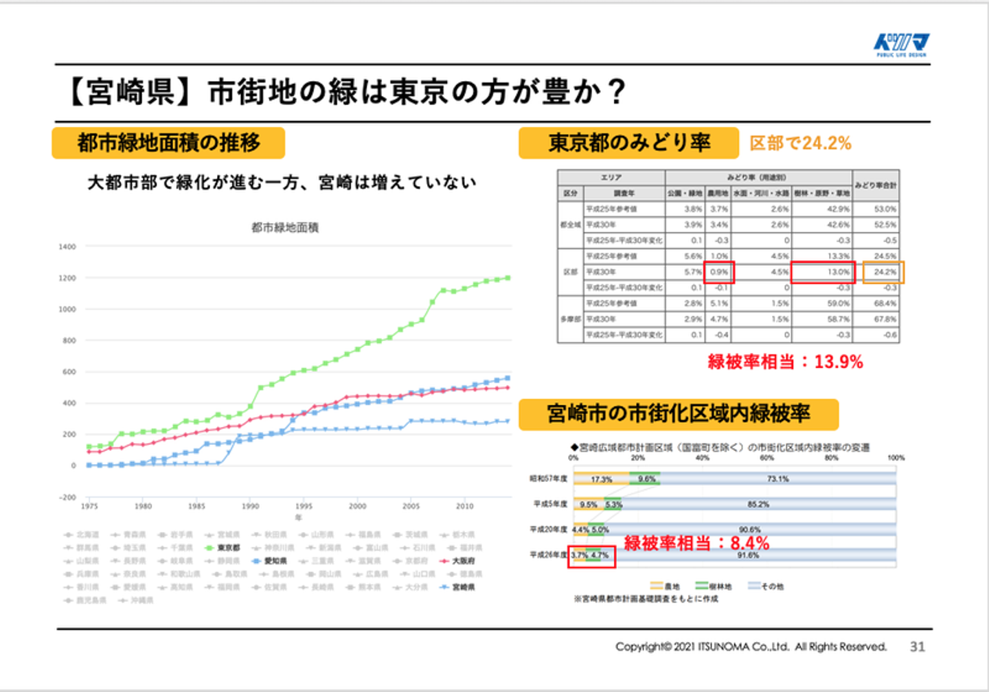 ただし、都市部にかぎると、緑地面積は伸びておらず、案外、東京のほうが伸びていたりします。