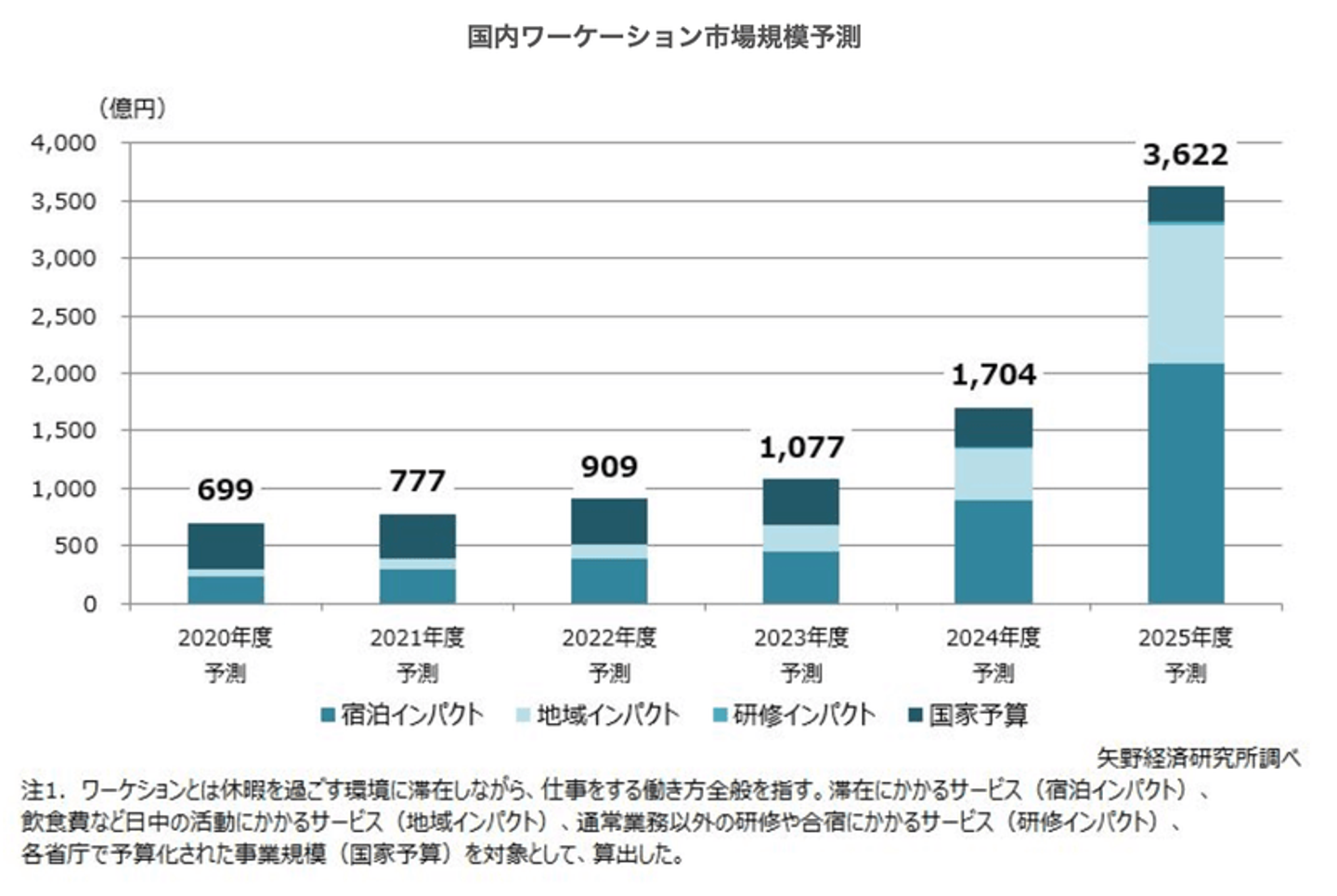 2020年度から2025年度までの年平均成長率は約40%で推移し、2025年度の国内ワーケーション市場規模は2020年度の約5倍となる3,622億円に成長すると見込まれています。