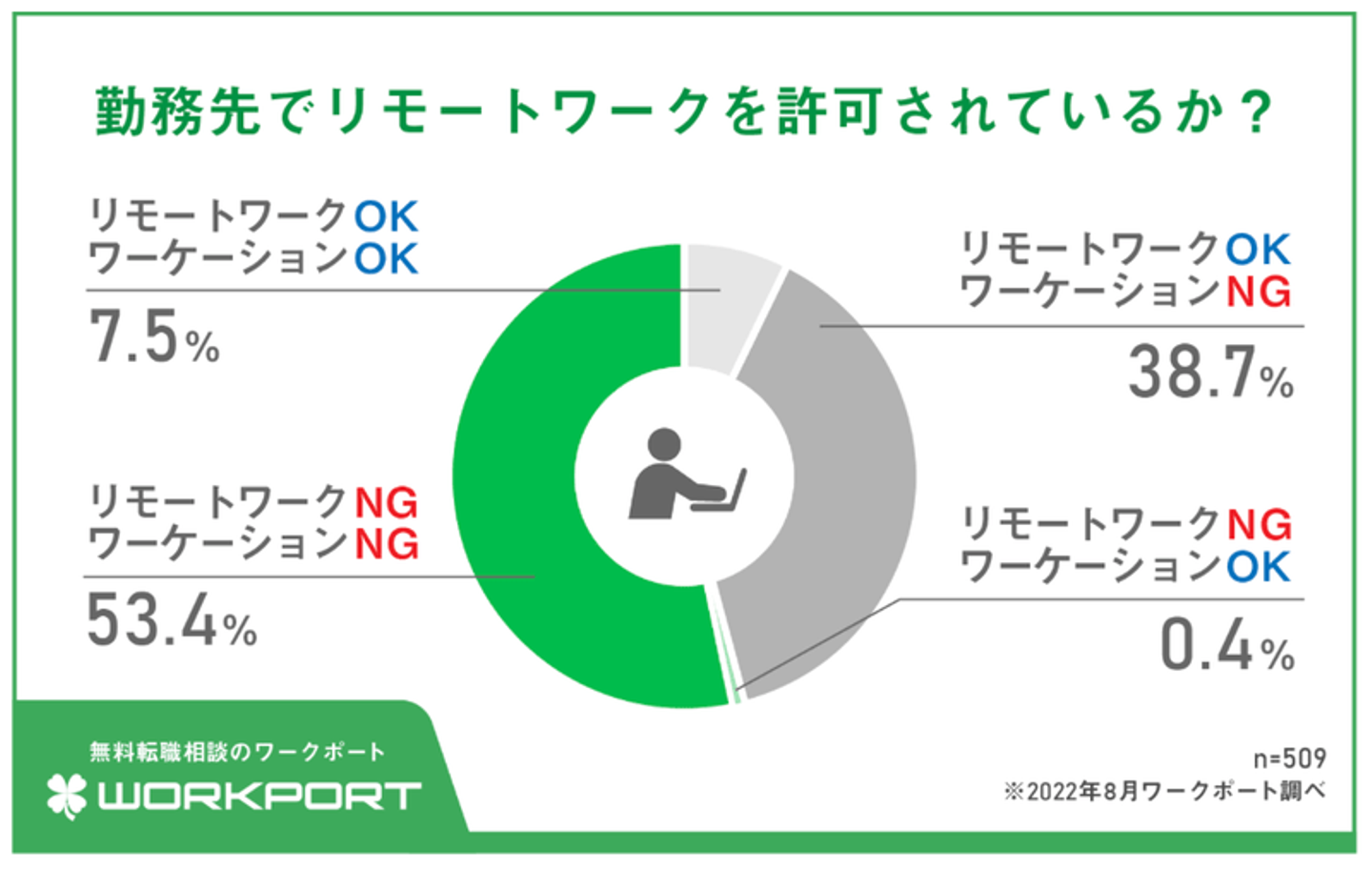 今後のニーズがどうなっていくのか、いまの職場ではリモートワークとワーケーション両方OKは7.5%と少数派。