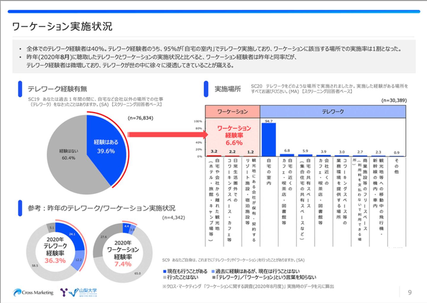 一方、実際にどれぐらいの利用者がいるのかとみると、テレワーク経験者は40%近く、ワーケーションは6.6%とまだまだマイノリティ。