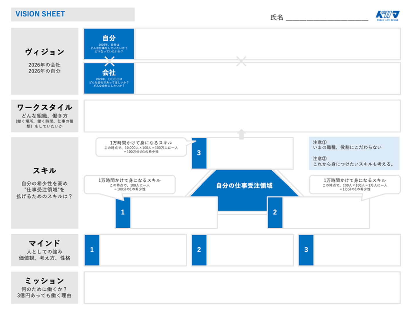 さらに、以前に前職でもお世話になった藤原和博さんが、1万時間かけたスキルを3つ重ね合わせていくことで希少人材になれる、という考え方を参考にして、VISION SHEETに反映していました。