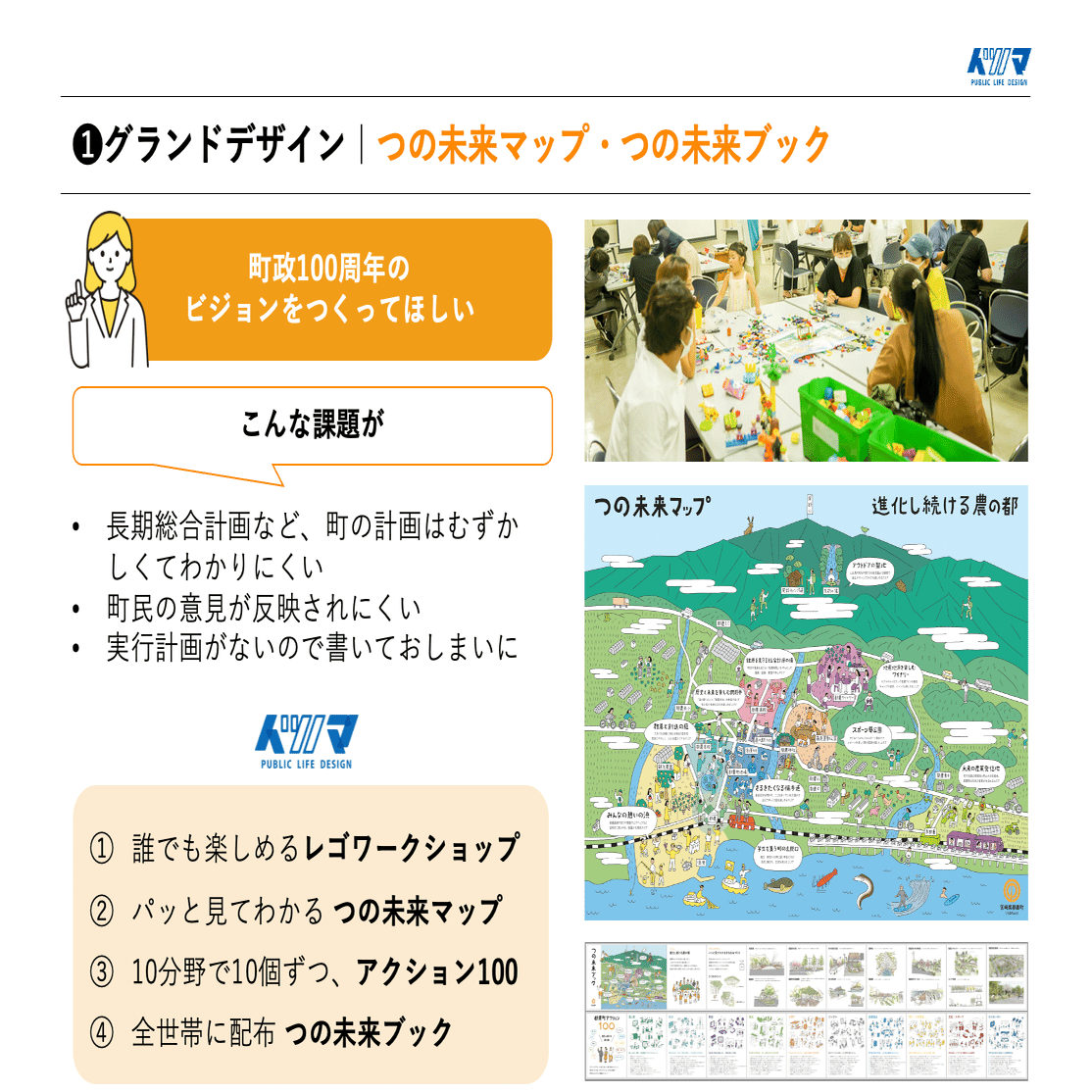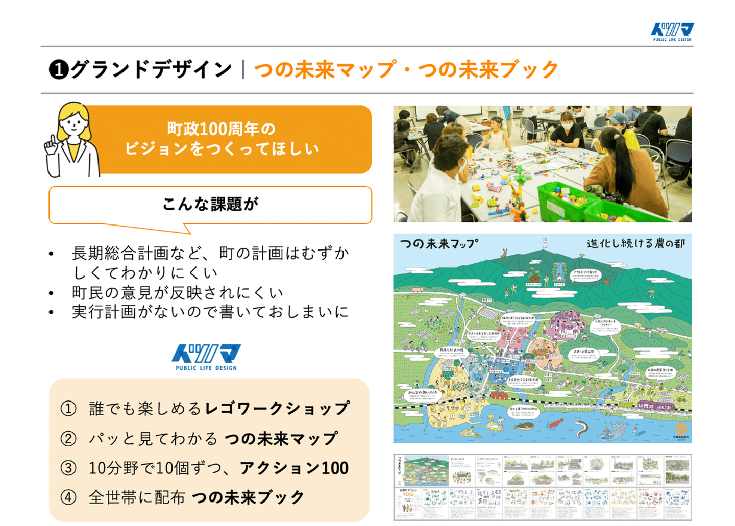 レゴを活用して、250名近い町民のみなさんと20回以上のワークショップを重ねたアウトプットの一部は、「つの未来マップ」として町内に掲示。