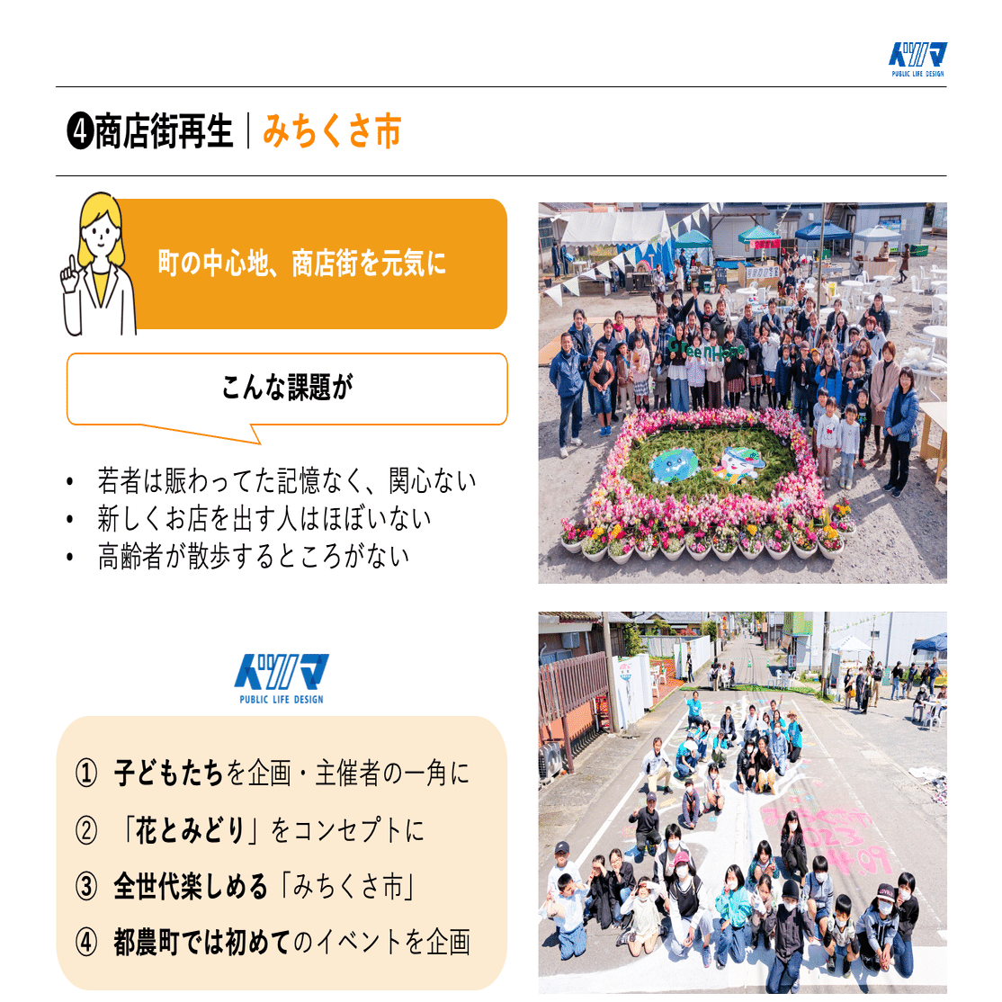 歩きたくなるきっかけづくりに、商店街の真ん中の空き地で、小中学生と一緒に「花とみどりで商店街を元気に!」をコンセプトに「みちくさ市」を開始。