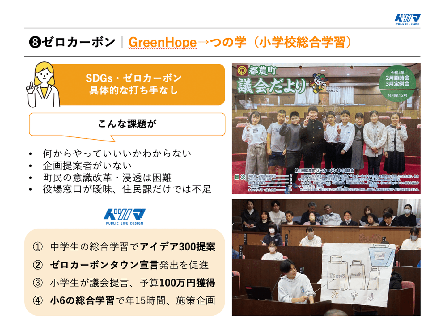 小学生の選抜チームで議会に提言をはじめてから今年度は3校ある小学校の6年生全員の総合学習プログラム「つの学」として進化。