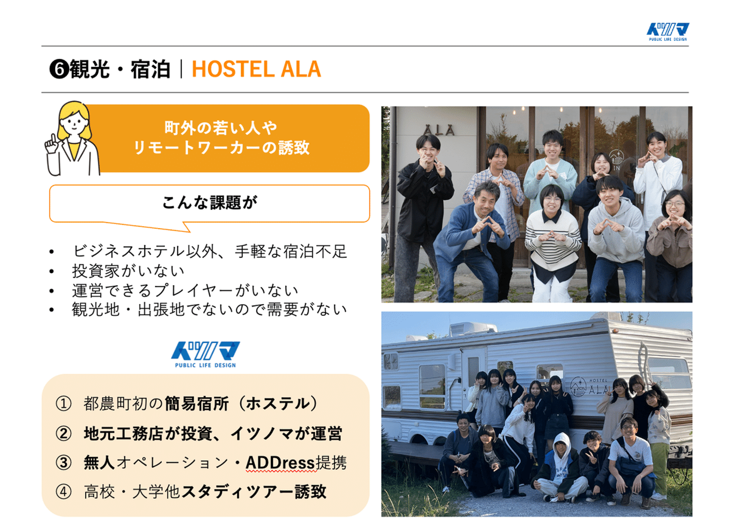 観光地でも出張地でもない都農町で、「まちづくりの合宿所」をコンセプトに5,000㎡の耕作放棄地にある2件の空き家と1台のトレーラーをリノベーションしてつくったHOSTEL ALA。