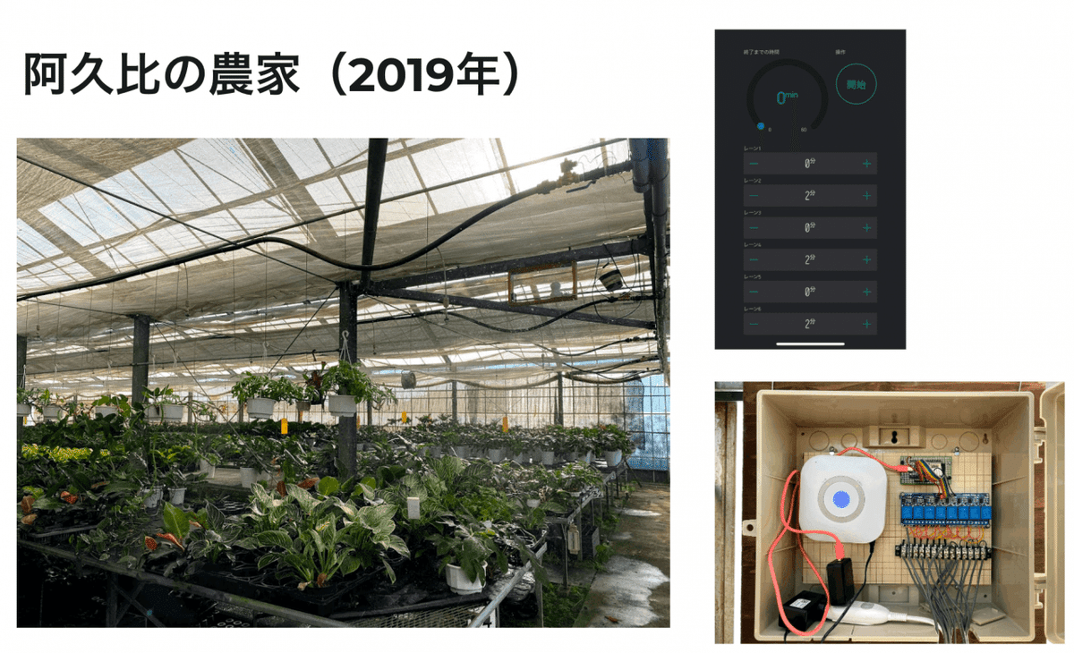 そんな中、知り合いからJAの人を紹介してもらい、観葉植物を育てている施設の水やりの遠隔化の相談を受けました。そこで無職だったこともあり、実費だけでスマホから水やりができるシステムを作ったところ大変喜んでもらえました。その生産者の方は1年360日は施設に行って水やりをしていたそうです。私はWebカメラの設置と少しの電子工作をしただけなのですが、年間で何十時間もの節約になりました。この経験から私も嬉しかったのと同時に、農業のIT化の遅れの現状を知ることになりました。