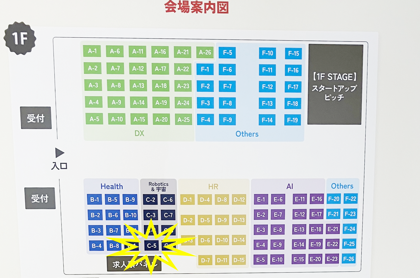 当日、いざ会場に着いてみると、当社は「Robotics&宇宙」のカテゴリーに入っていて、「C-5」という場所に割り当てられていました。