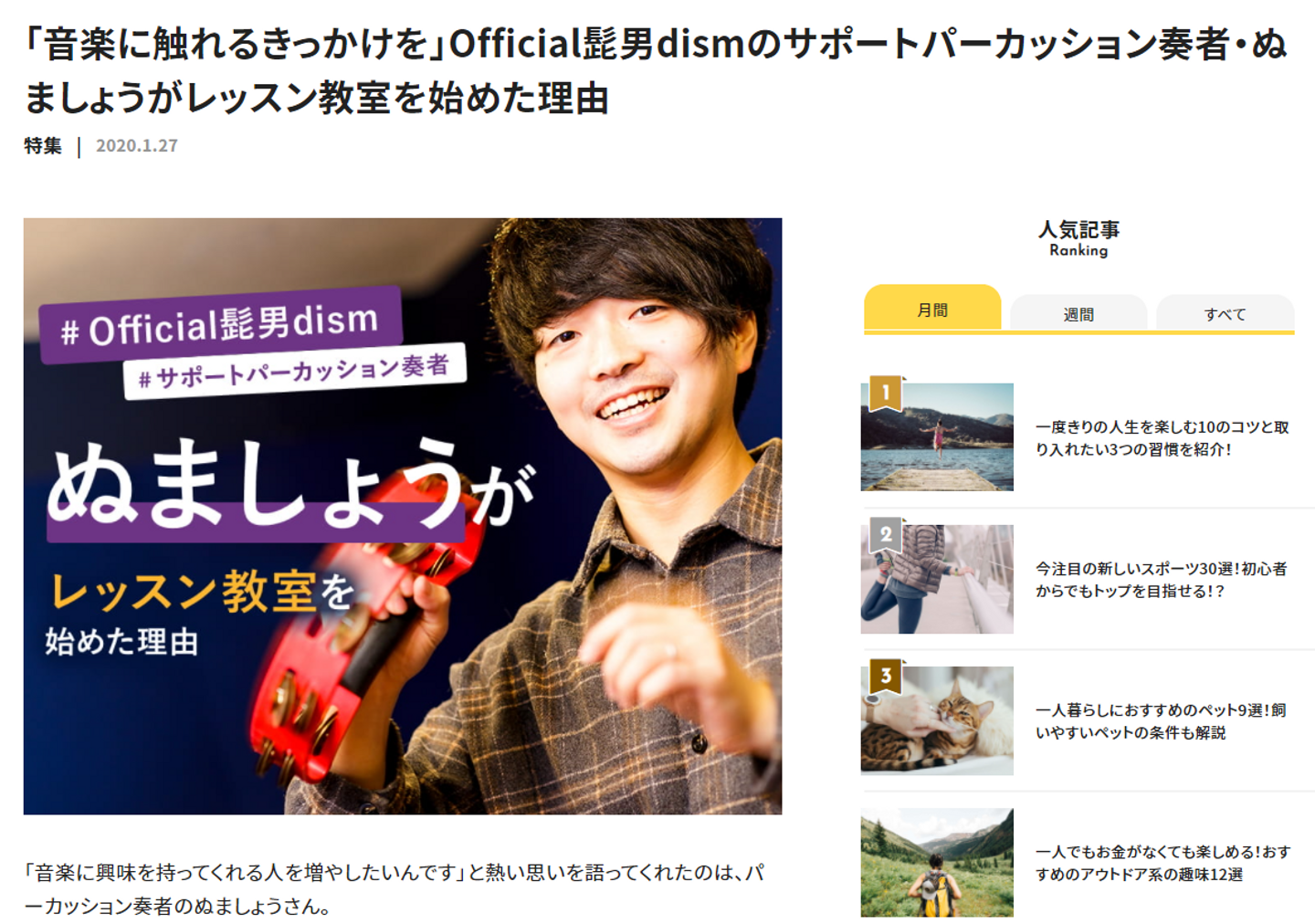反響が高かった記事の1つは、official髭男dismのサポートメンバー経験のあるパーカッション奏者ぬましょうさんの記事です。