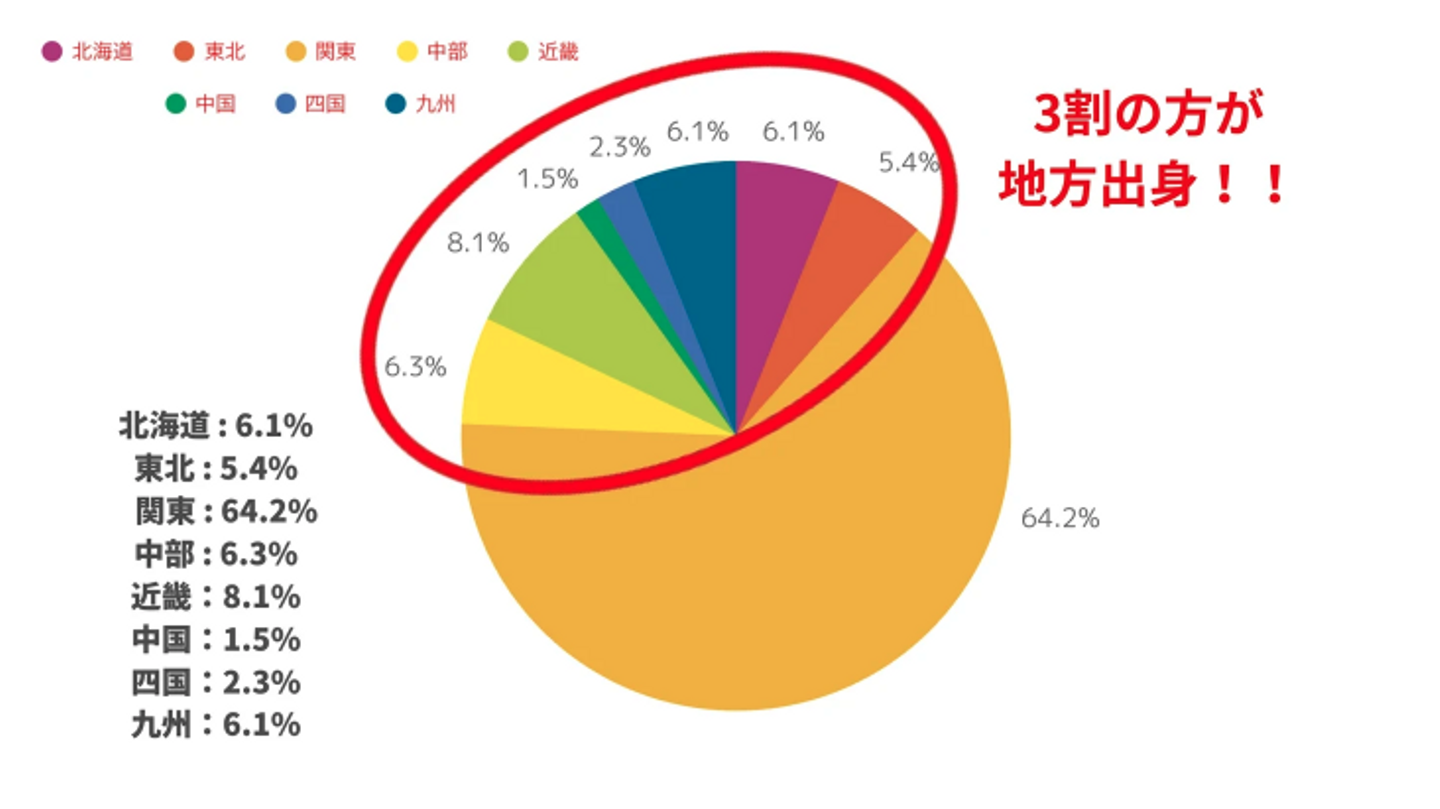 関東出身のメンバーが全体の約6割と一番多いですが、それ以外にも北海道、東北、中部、近畿、中国、四国、九州など、地方からも3割の方が在籍しておりバラエティ豊かな出身地がそろっています。こうした全国からの人材の集まりは、当社にとっての大きな財産であり、文化の一部でもあります。一人ひとりの出身地や背景の違いが、職場に自然な多様性と柔軟性をもたらしており、その多様性こそが、より創造的で風通しのよい社風につながっています。