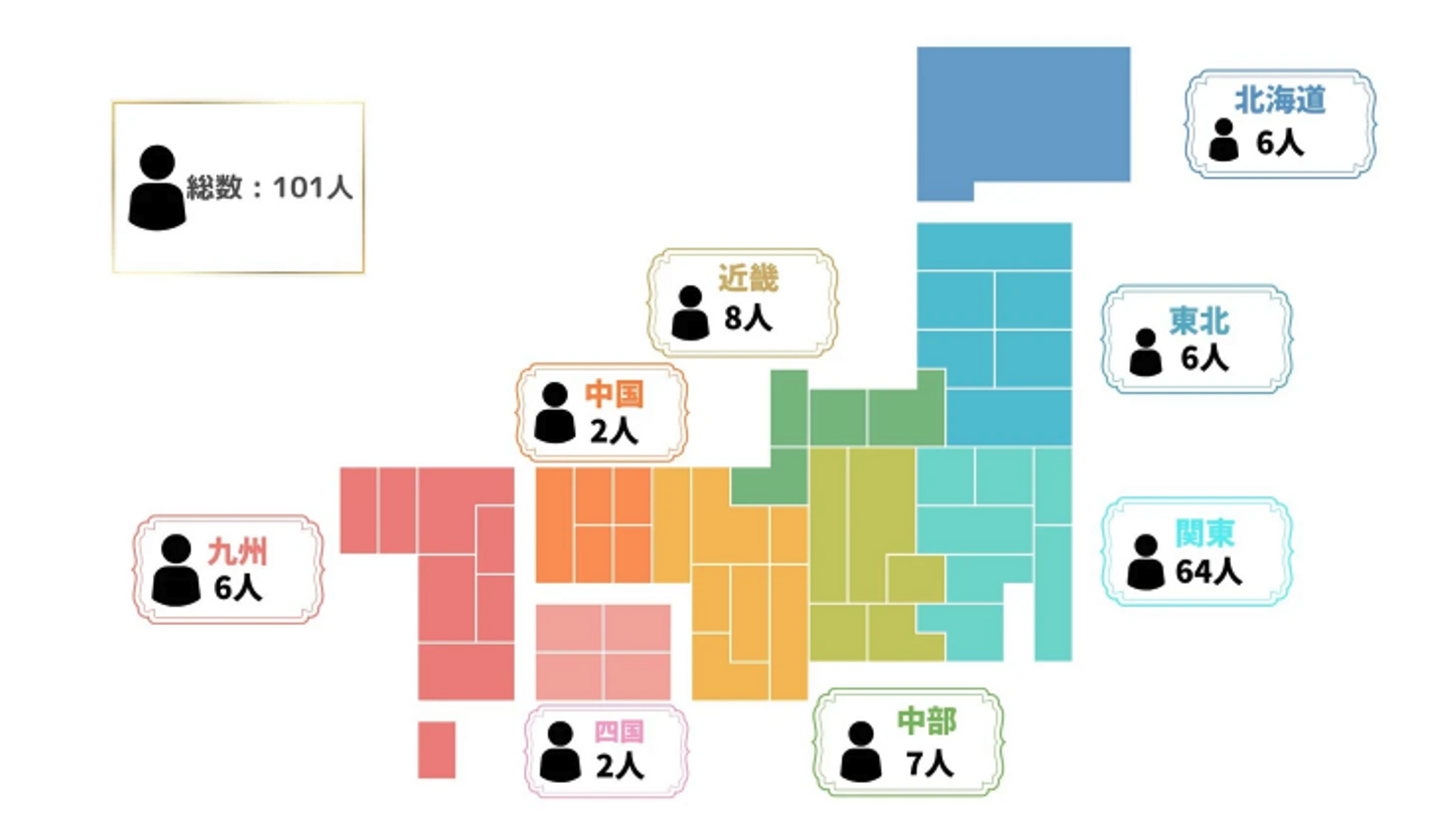 現在、社員数はおよそ101人。出身地を見ると、沖縄を除いた8つの地域から在籍しています。北海道から九州まで、全国各地の社員がそれぞれの役割で力を発揮しています!