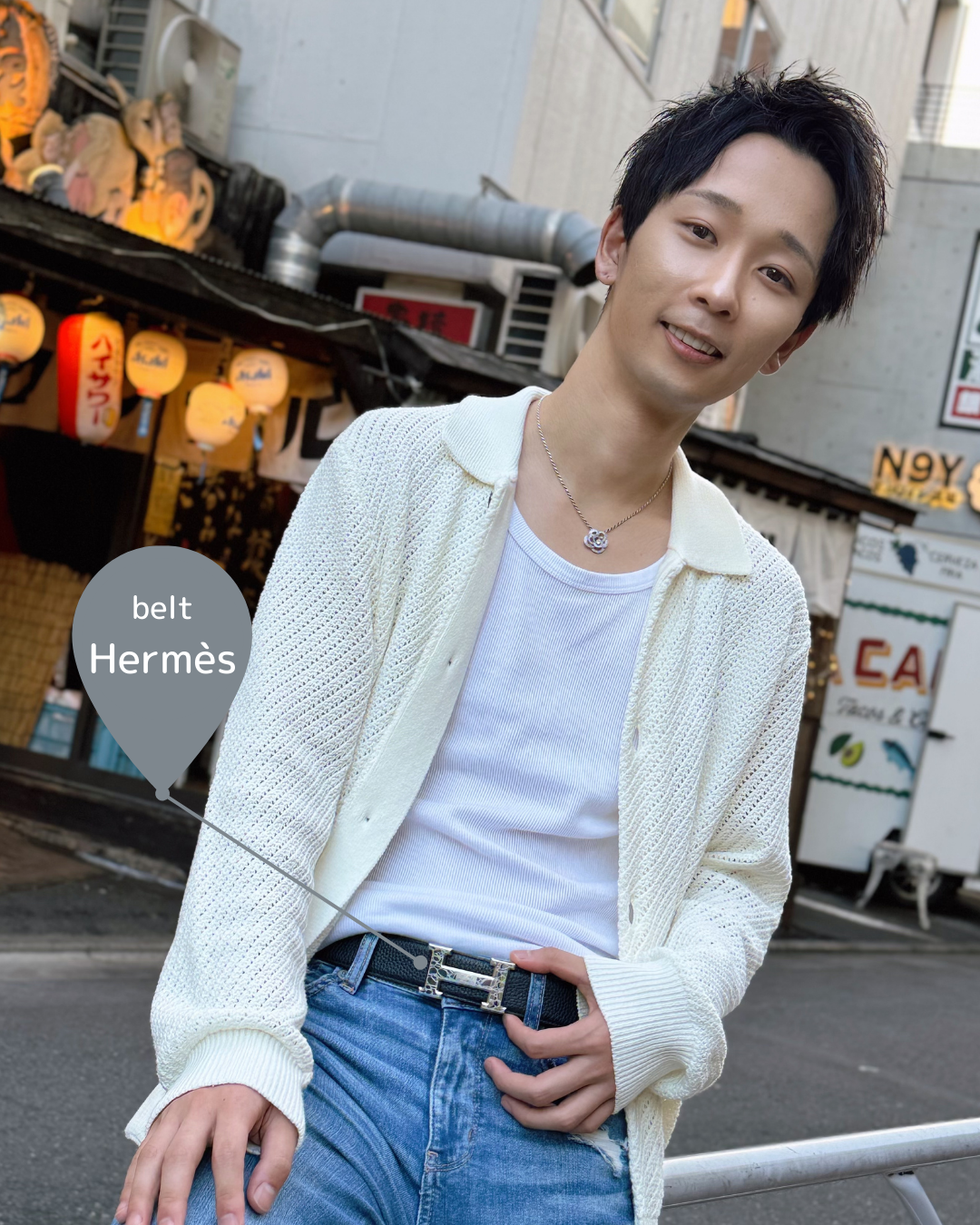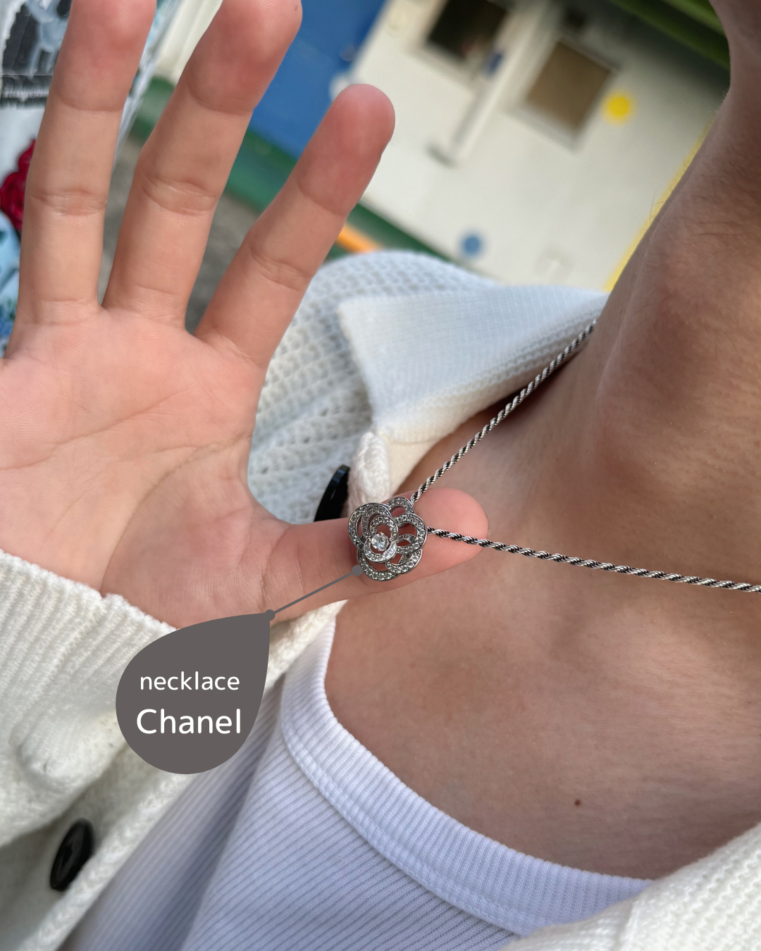 アクセサリーにはChanelのネックレスを取り入れ、上品さをプラス。
