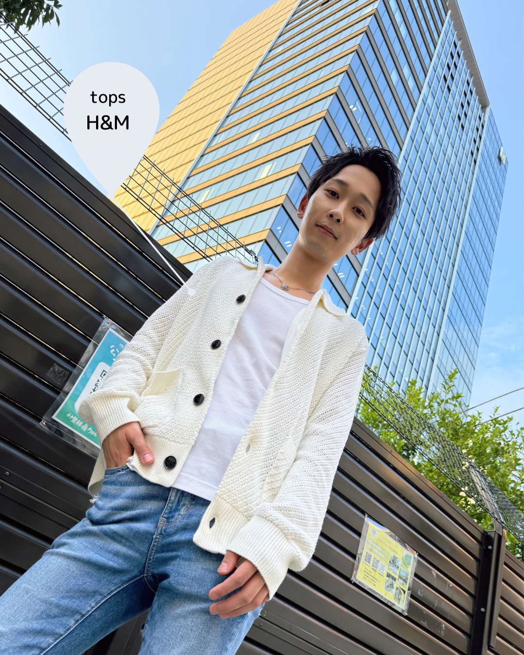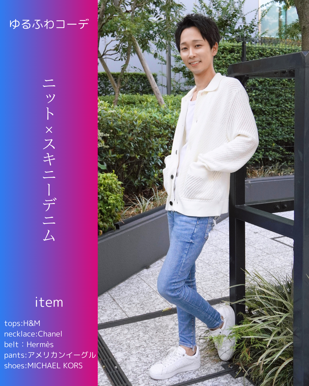 白いニットは清潔感を演出し、スキニーデニムとの組み合わせでスタイルの良さを強調しています。