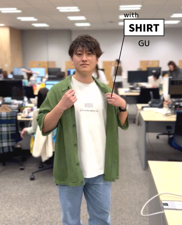 コーデが難しい季節に重ね着することで、温度調節も計算されていて、さすがマーケティング事業部です!!