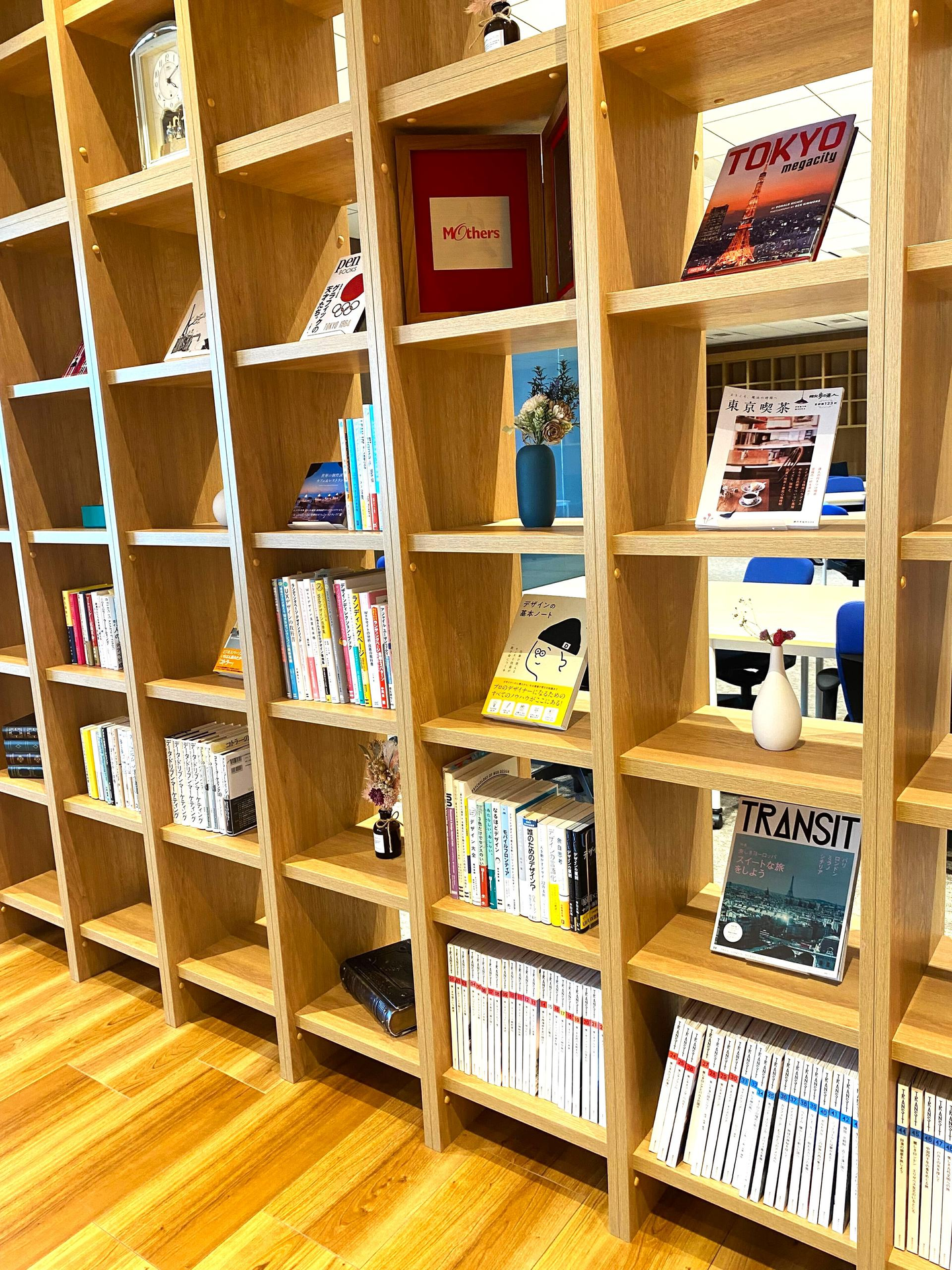 各所に本棚もあり、色々なジャンルの本が飾られています。もちろん興味のある本は貸出OKです。これからもどんどん増える予定なので、気になる本はぜひ手に取ってみてください♪