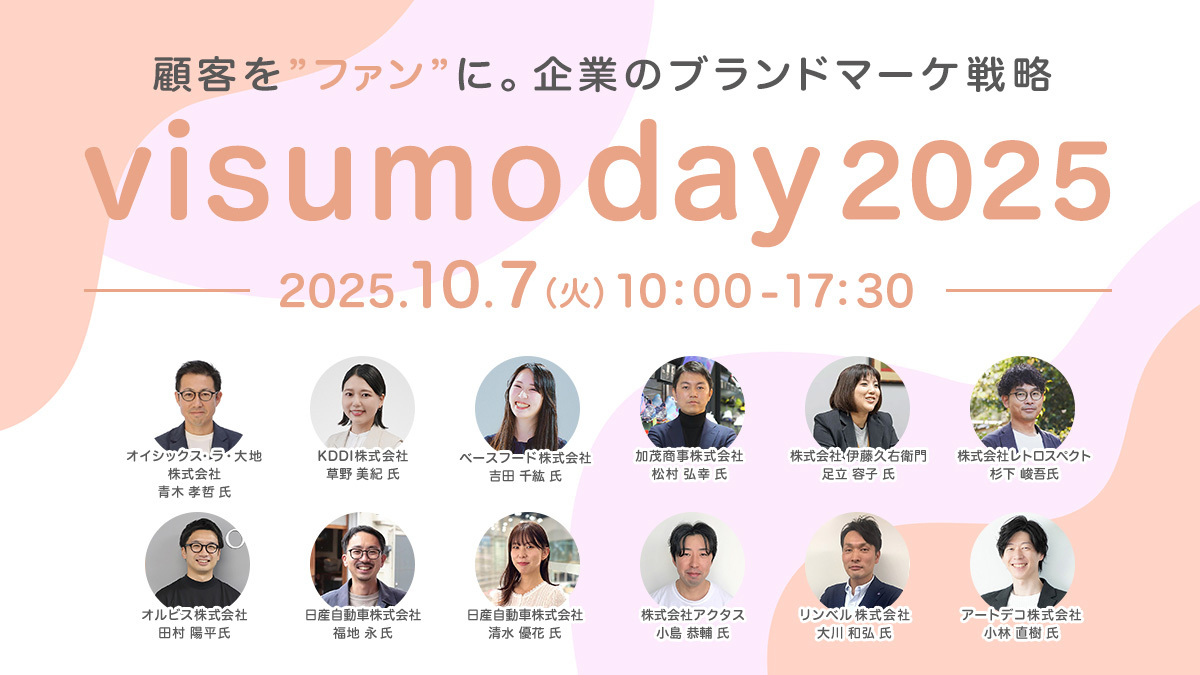 イベント概要 イベント名:visumo day 2025 〜 顧客を”ファン”に。企業のブランドマーケ戦略 〜 開催日程:2025年10月7日(火) 10:00 - 17:30 開催形式:オンライン開催 参加費:無料/事前登録制 参加対象:企業のマーケティング、EC部門、新規事業・サービス開発の担当者様など 主催:株式会社visumo
