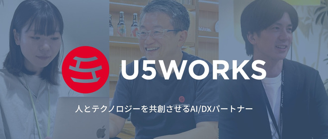 【理性(IT/AI)と人間性(感性)を「融合」させて、人がもっとクリエイティブに集中できる環境を創り出す】 人が単純な作業に時間を割き続けるのではなく、新たな「もの」の創造にチャレンジできる環境を生み出すのがU5WORKSのミッションです。 小さなひらめきや独特なアイデアで既にあるシステムやサービスを一体にし、 新たなサービスを創り出し困っているさまざまな現場を支える、 本当に役立ち利用される「もの」をつくりさらに良いものへと進化させます。
